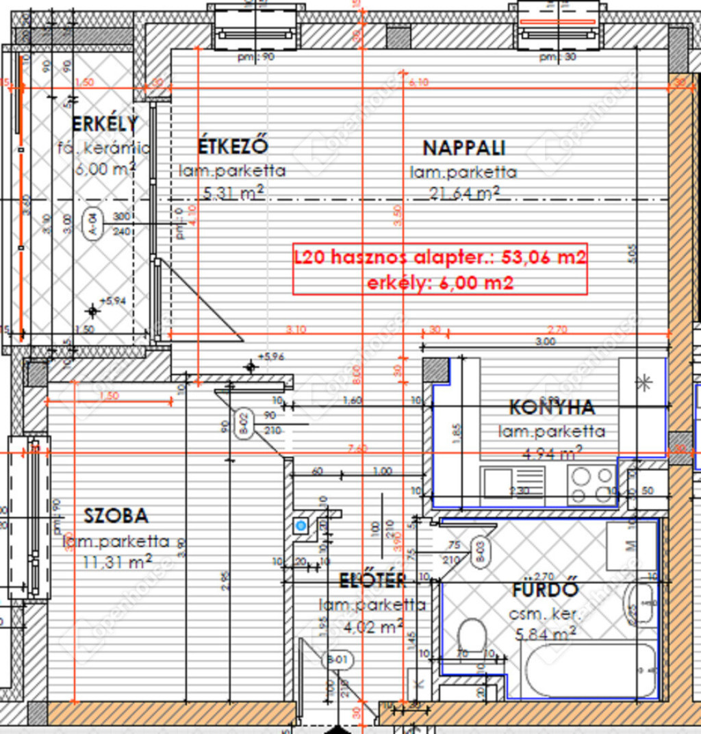 nettó 53,06 m2-es lakás + 6,00 m2-es fedett erkély