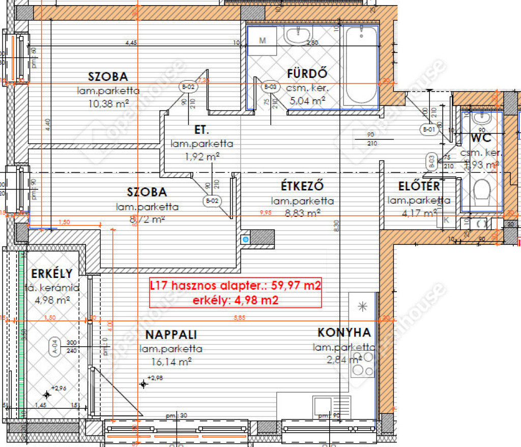 nettó 59,97 m2-es lakás + 4,98 m2-es fedett erkély