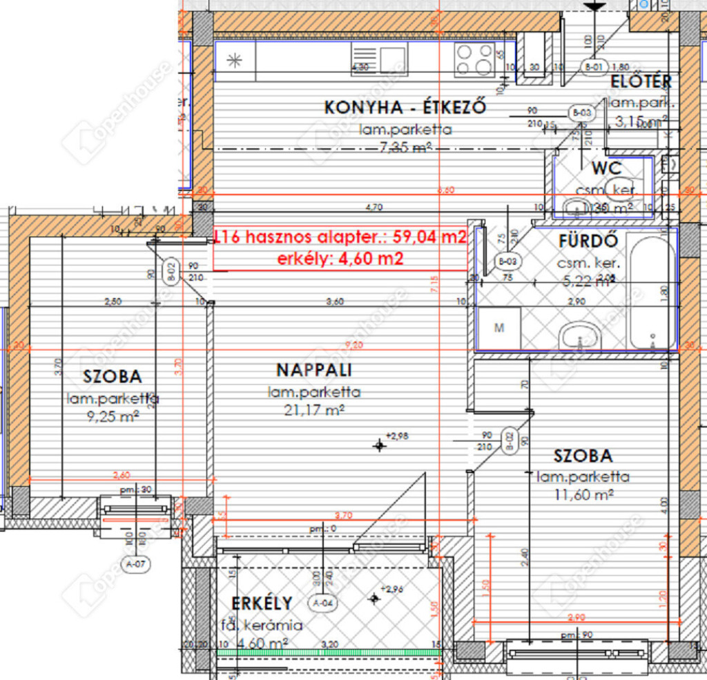 nettó 59,04 m2-es lakás + 4,60 m2-es fedett erkély