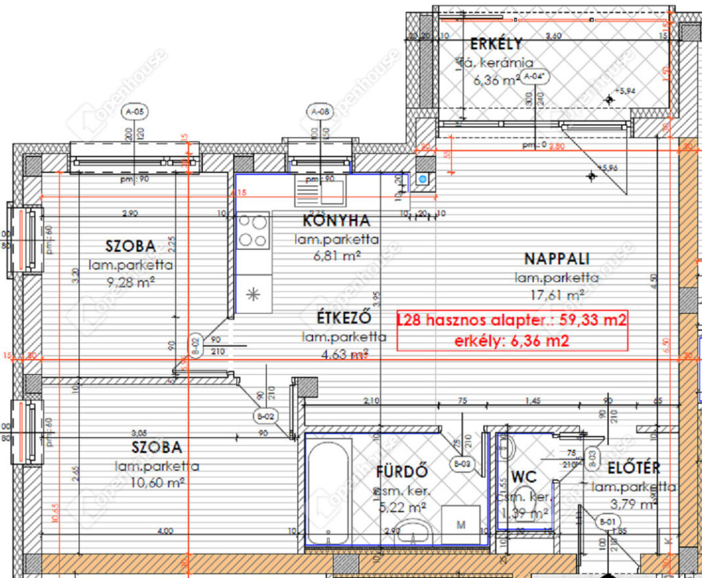 nettó 59,33 m2-es lakás + 6,36 m2-es fedett erkély