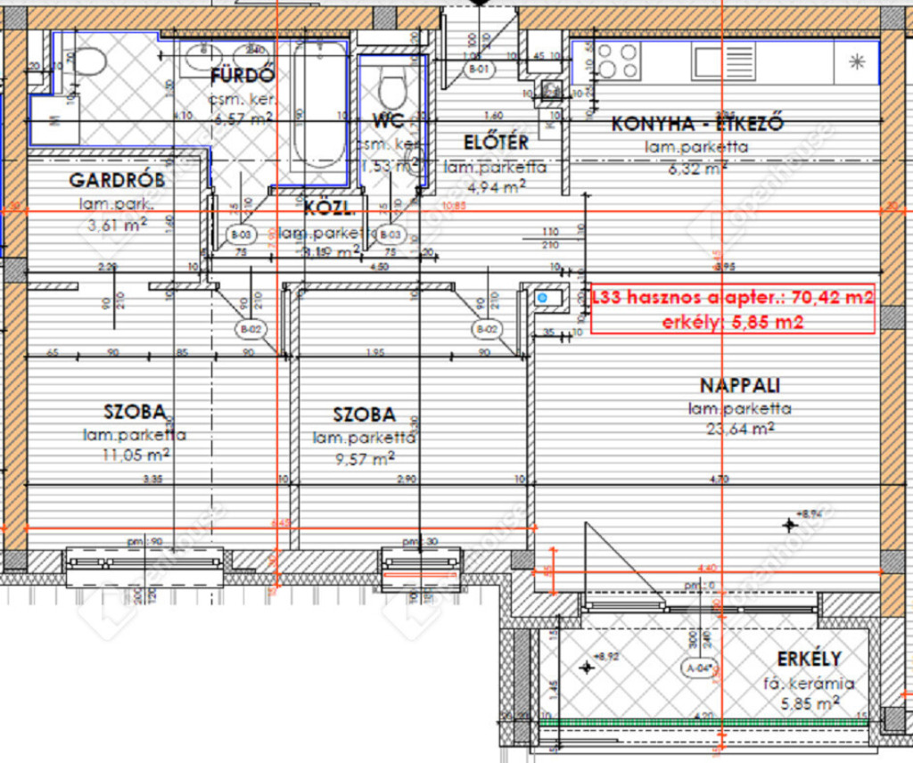 nettó 70.42 m2-es lakás + 5,85 m2-es fedett erkély