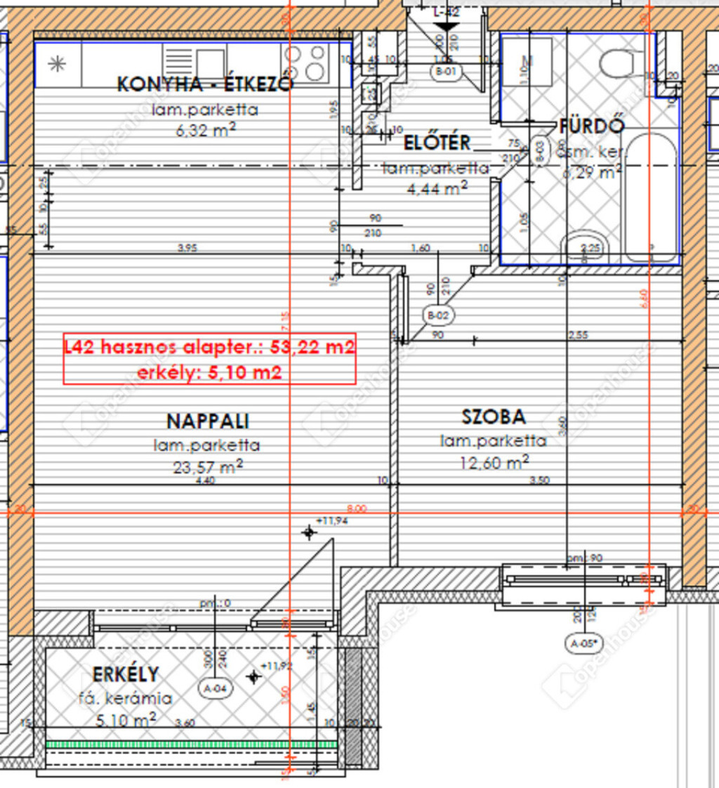 nettó 53,22 m2-es lakás + 5,10 m2-es fedett erkély
