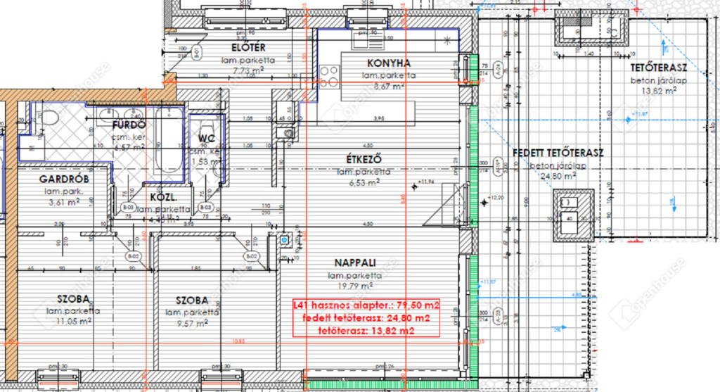 nettó 79,05 m2-es lakás + 24,8 m2-es fedett erkély + 13,82 tetőterasz