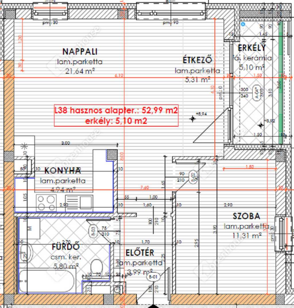 nettó 52,99 m2-es lakás + 5,10 m2-es fedett erkély