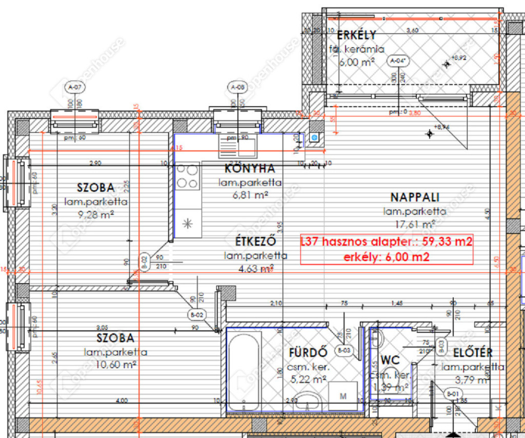nettó 59,33 m2-es lakás + 6,00 m2-es fedett erkély
