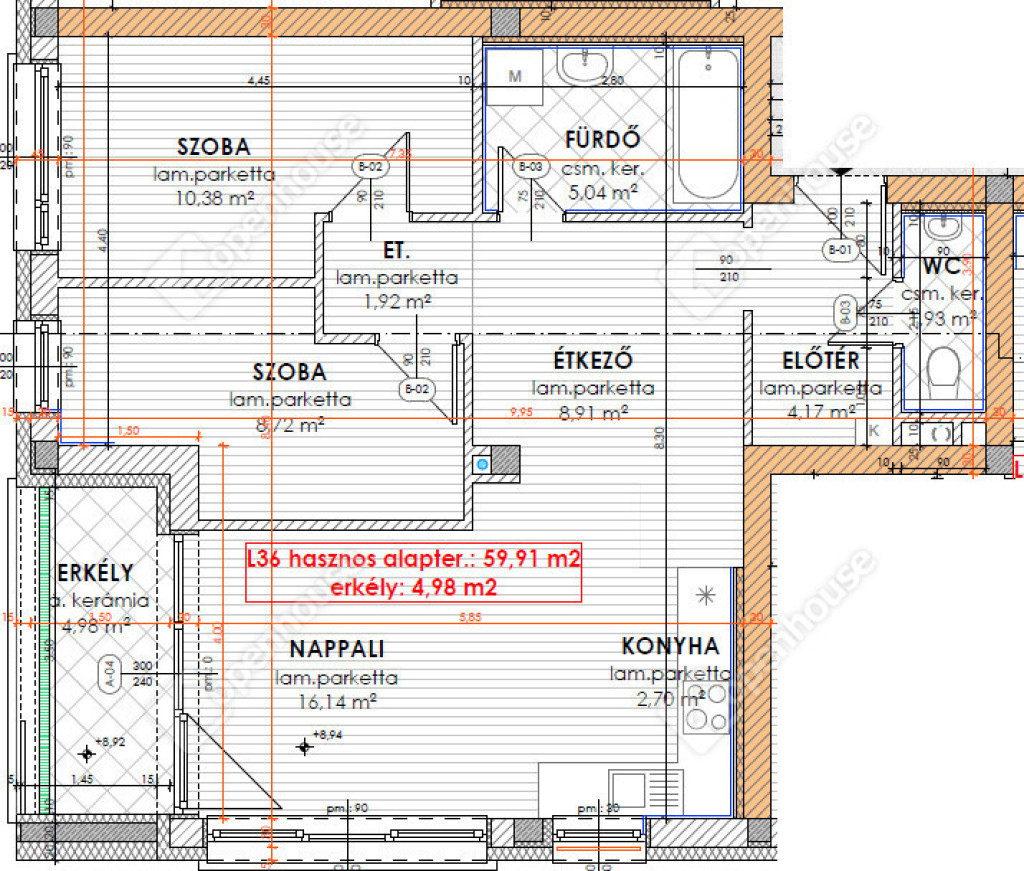 nettó 59,91 m2-es lakás + 4,98 m2-es fedett erkély