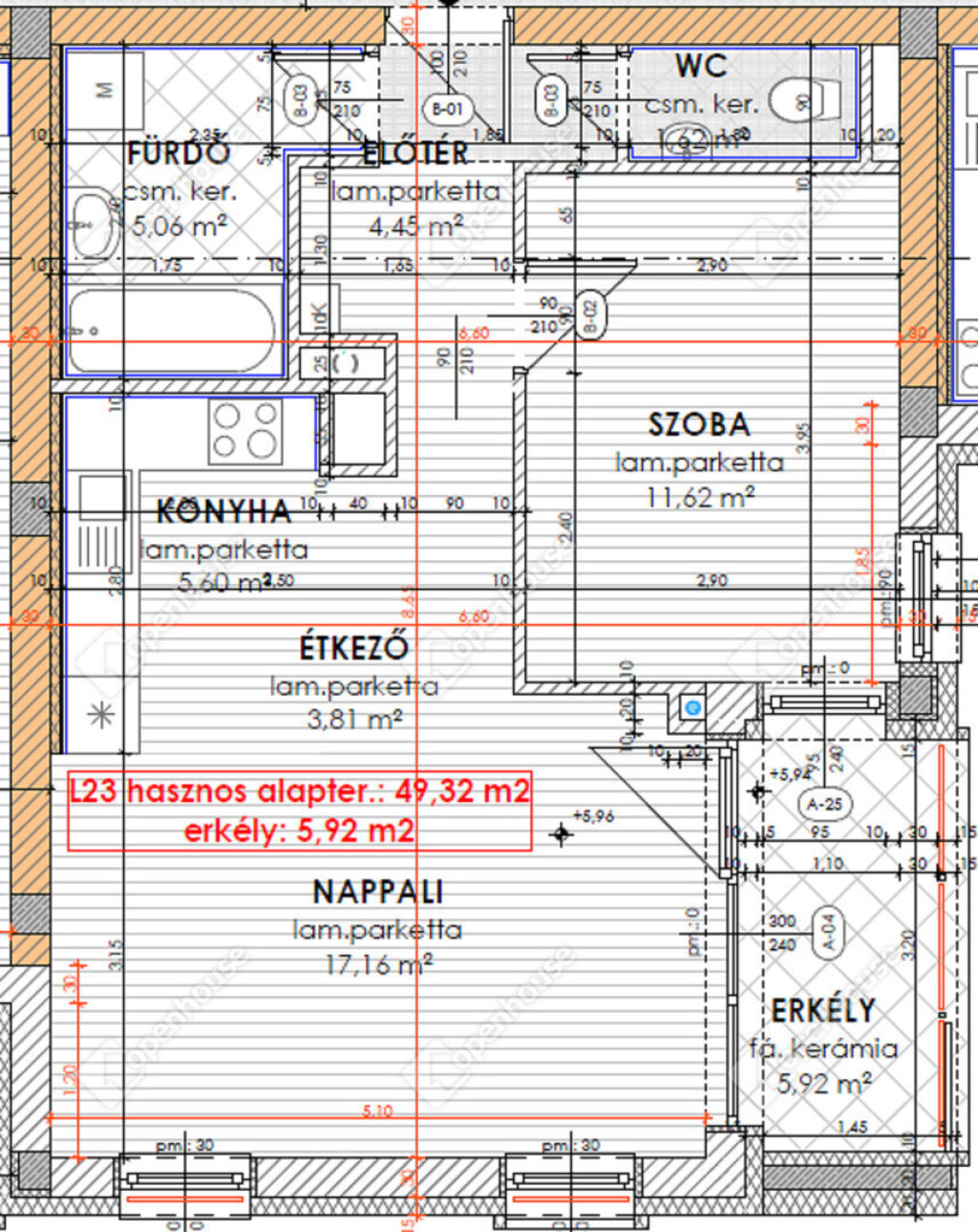 nettó 49,32 m2-es lakás + 5,92 m2-es fedett erkély