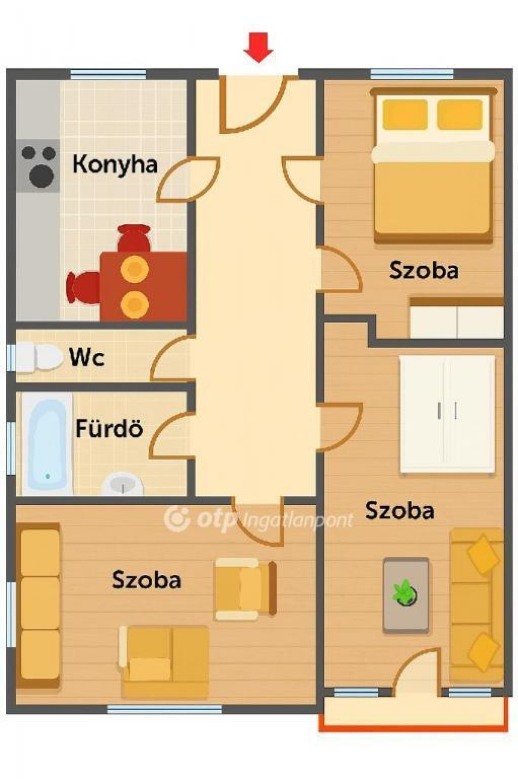 A lakásban 1 tágas szoba és 2 kisebb félszoba, külön fürdőszoba és WC, valamint konyha található, amelyeket egy praktikus folyosó köt össze. Az ingatlan karbantartott, jó állapotú, azonnal költözhető.