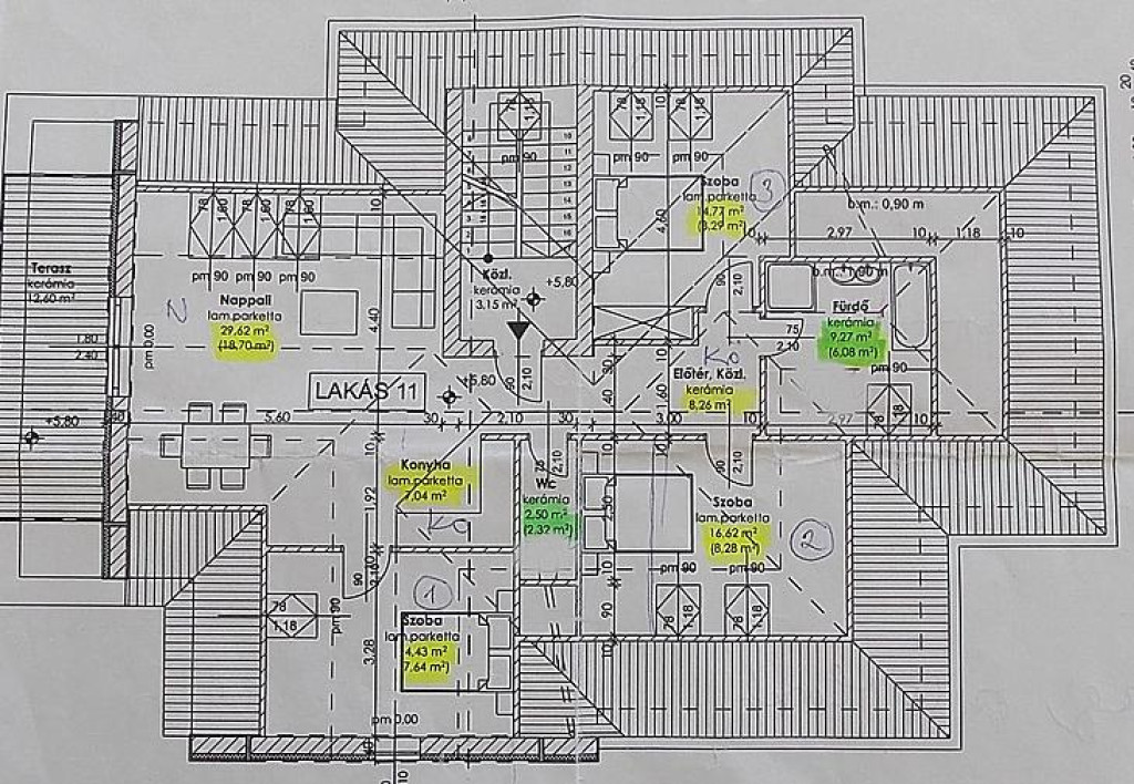 • Hasznos alapterület: 75 nm. (bruttó alapterület: 115nm). A tetőri lakás parapet magassága emelve van. A helyiségek kényelmesen vannak kialakítva. Elosztása: 3 hálószoba+ nappali + 2 fürdőszoba.