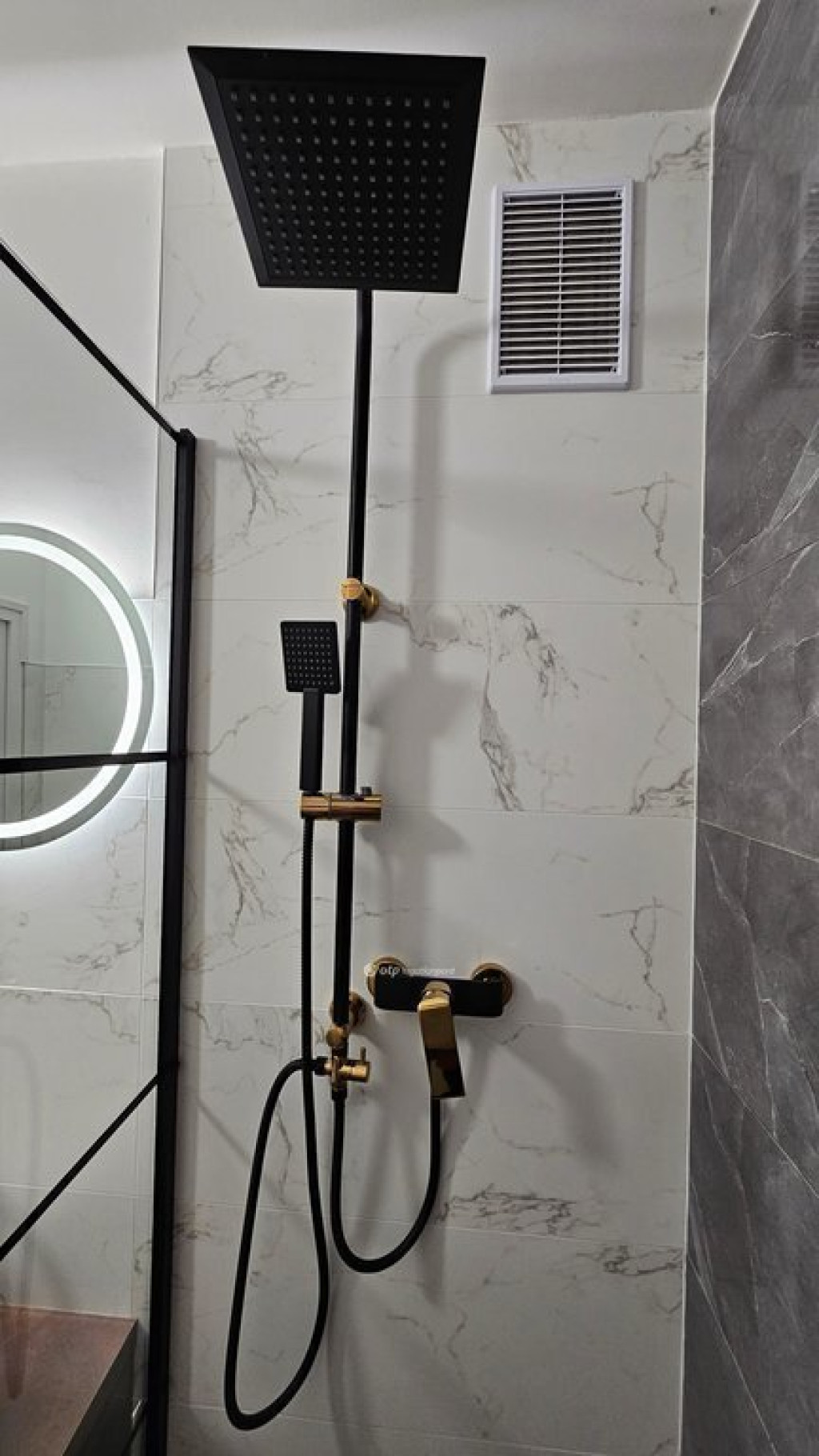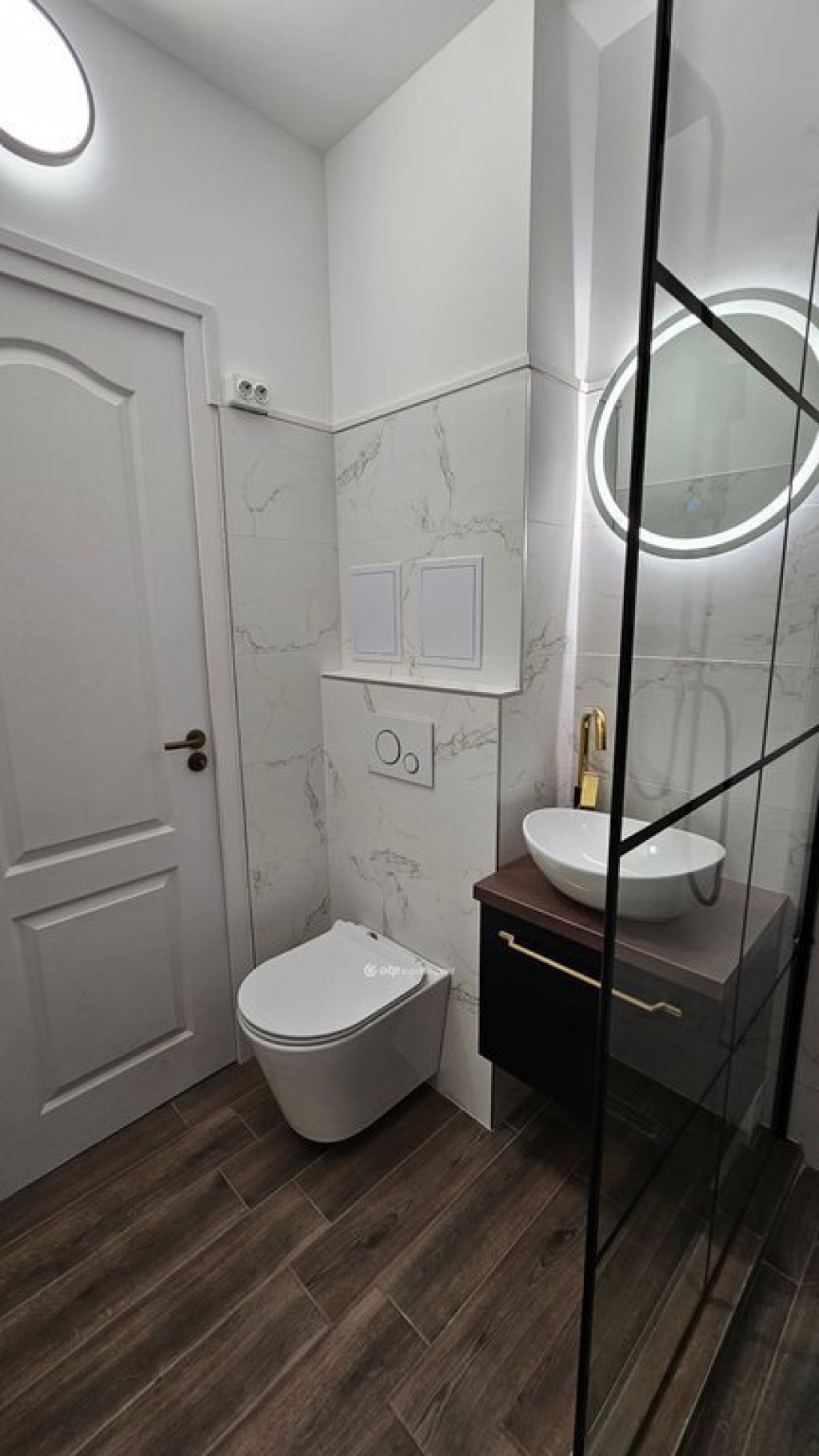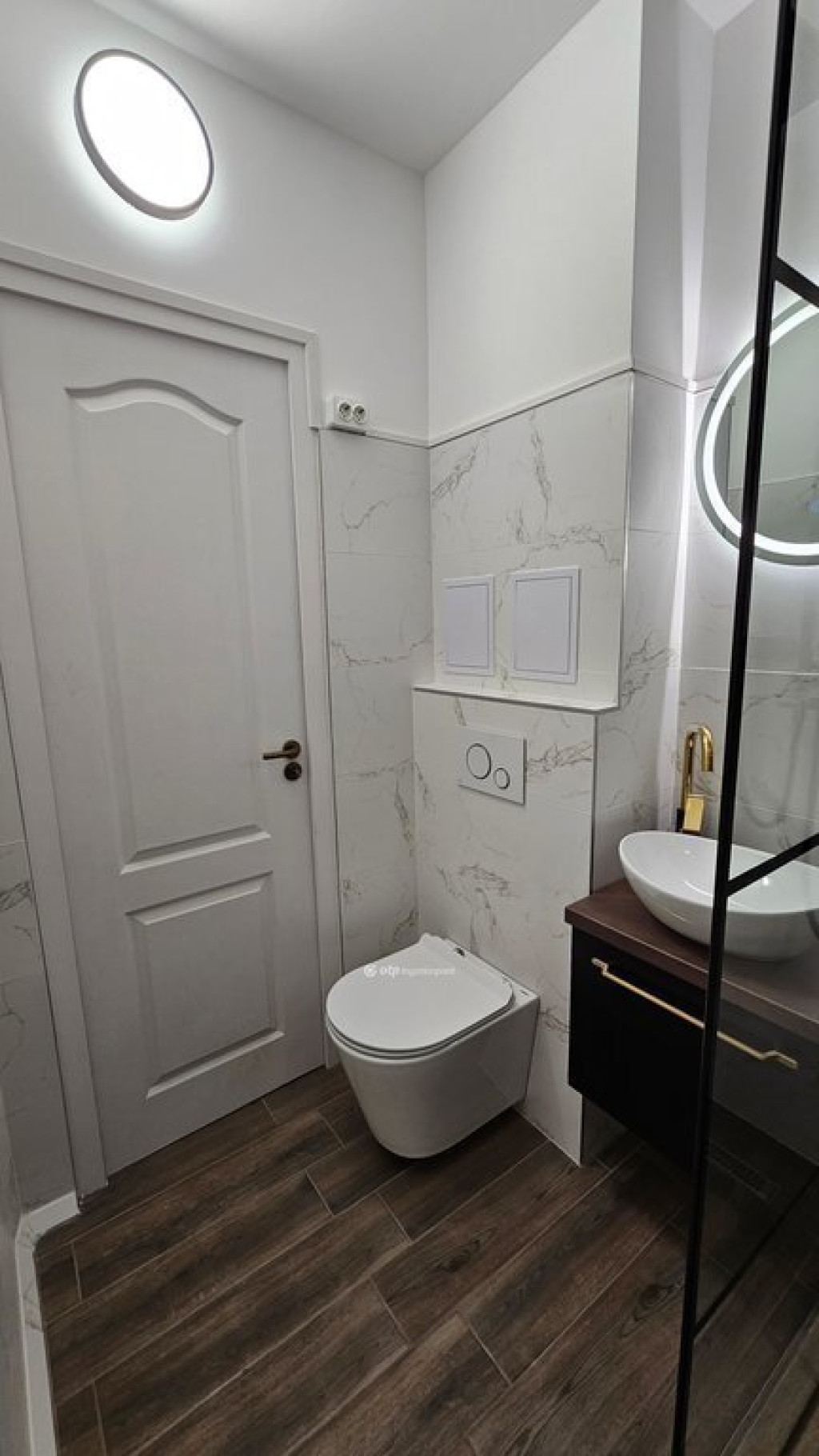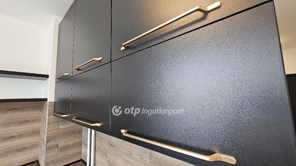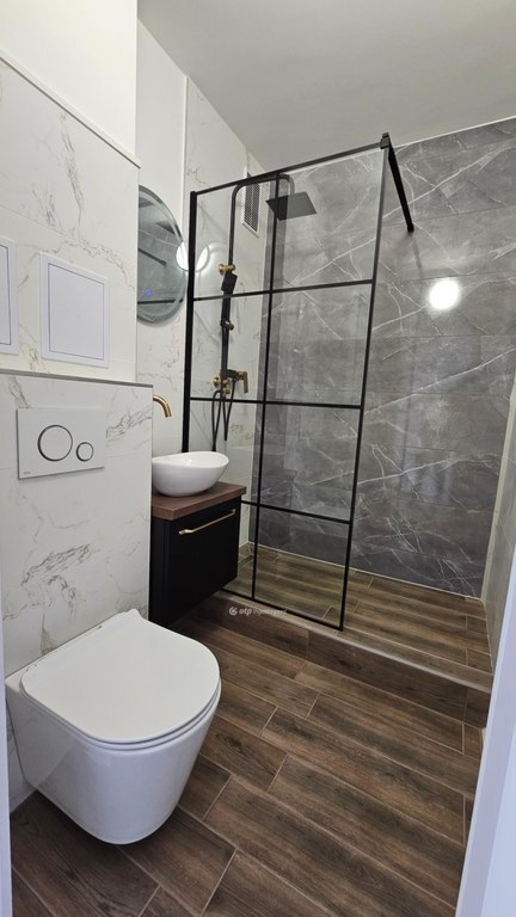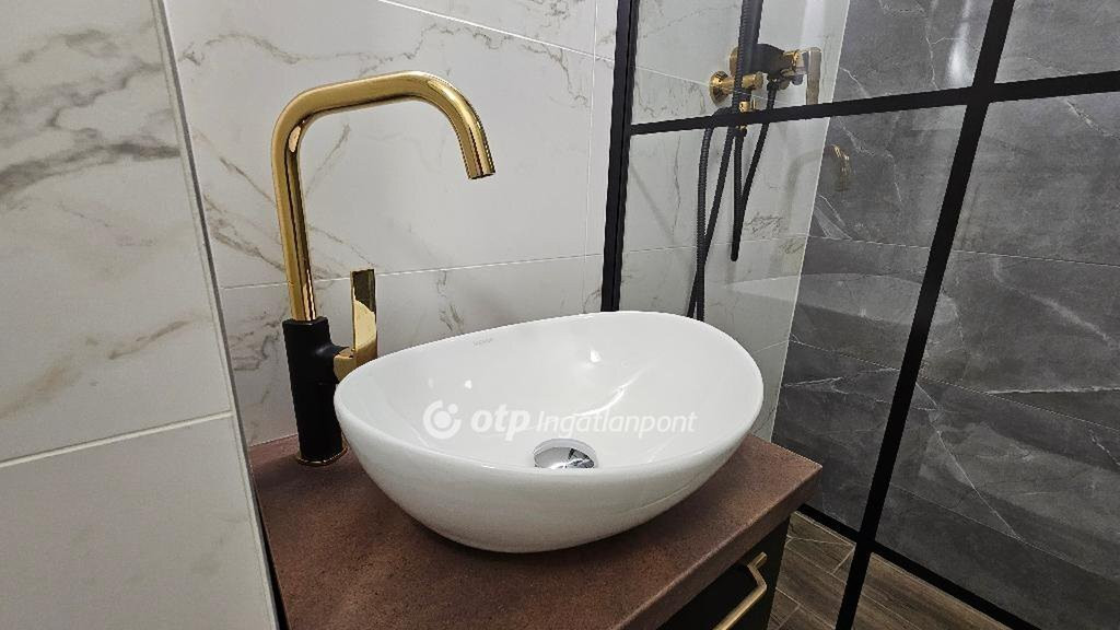 A 47m2-es lakás minden helyiségében meleg barna famintás padlóburkolat fut végig, amely egységes és barátságos alapot ad az enteriőrnek. A konyha különleges karakterét a fekete és arany színek elegáns kombinációja, valamint a meleg fa hatású felületek adják, az új konyhabútorba pedig modern, beépített gépek kerültek. A fürdőszoba letisztult, kortárs hangulatú, ahol a szürke és fehér csempék harmonikusan egészülnek ki fekete - arany bútorokkal és csaptelepekkel, prémium megjelenést teremtve. Az egész lakásban új, modern LED lámpák gondoskodnak a fényes, csillogó, mégis kellemes atmoszféráról.