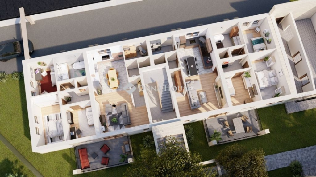 A 115 m²-es otthon három hálószobával, egy fürdőszobával, külön két WC-vel, amerikai konyhás nappalival és kamrával rendelkezik.