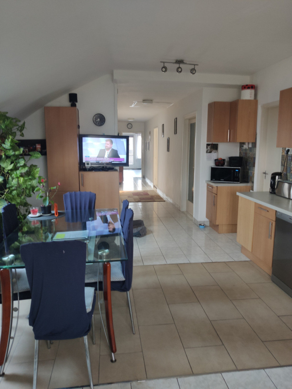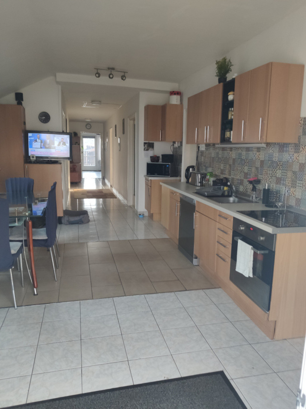 A konyha és étkező együtt van – mert a családi élet általában ott történik. Van kamra, külön WC, kádas fürdő – minden, ami egy valóban élhető otthonhoz kell.