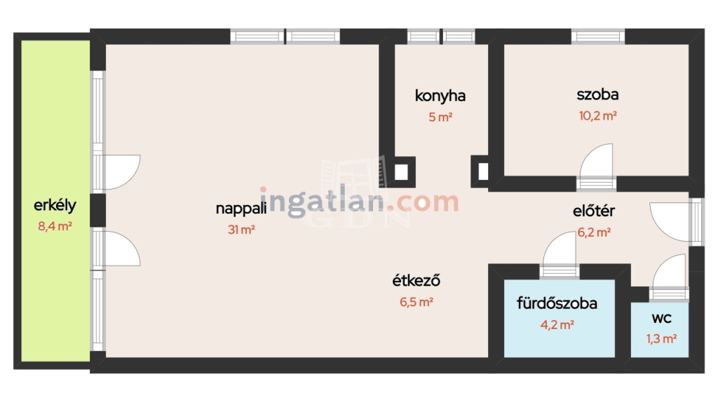 nappali 30,82m2, konyha 5m2, étkező 6,5m2, szoba 10,2m2, előtér 6,2 m2, fürdőszoba 3,6m2, toalett 1,33m2, fedett erkély 8,4m2;