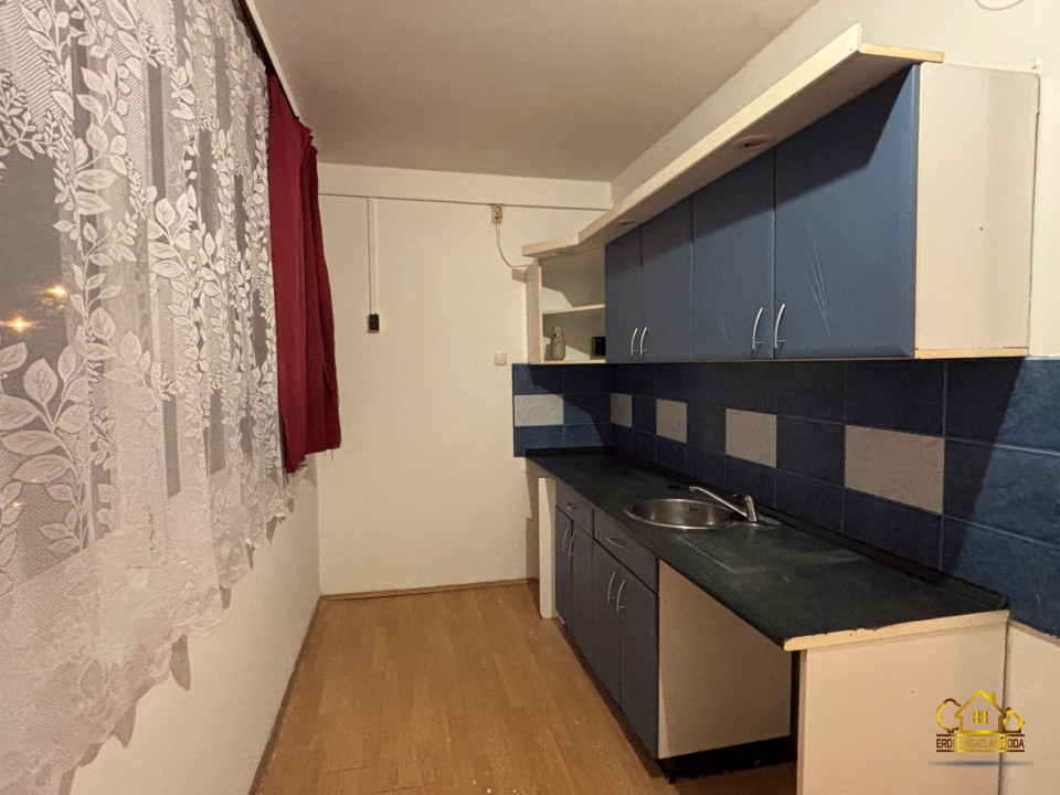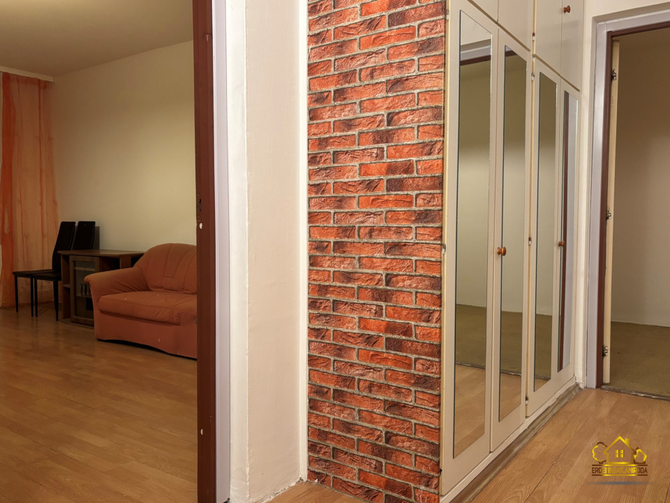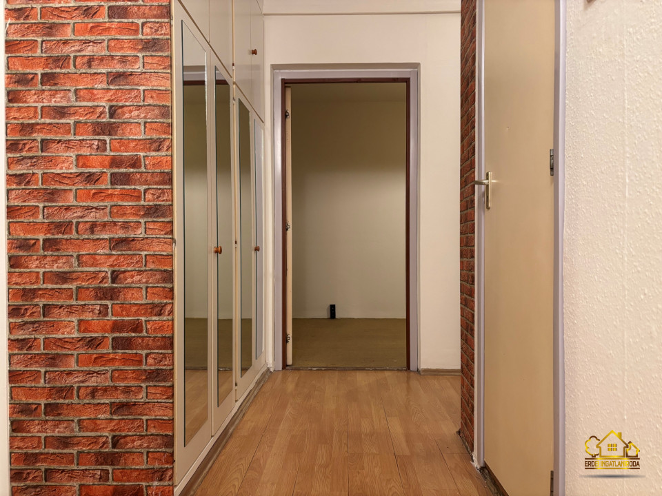 A lakás elosztása: előszoba, kettő külön bejáratú szoba, beépített tágas konyha ebédlővel, kádas fürdőszoba, külön WC helyiség.