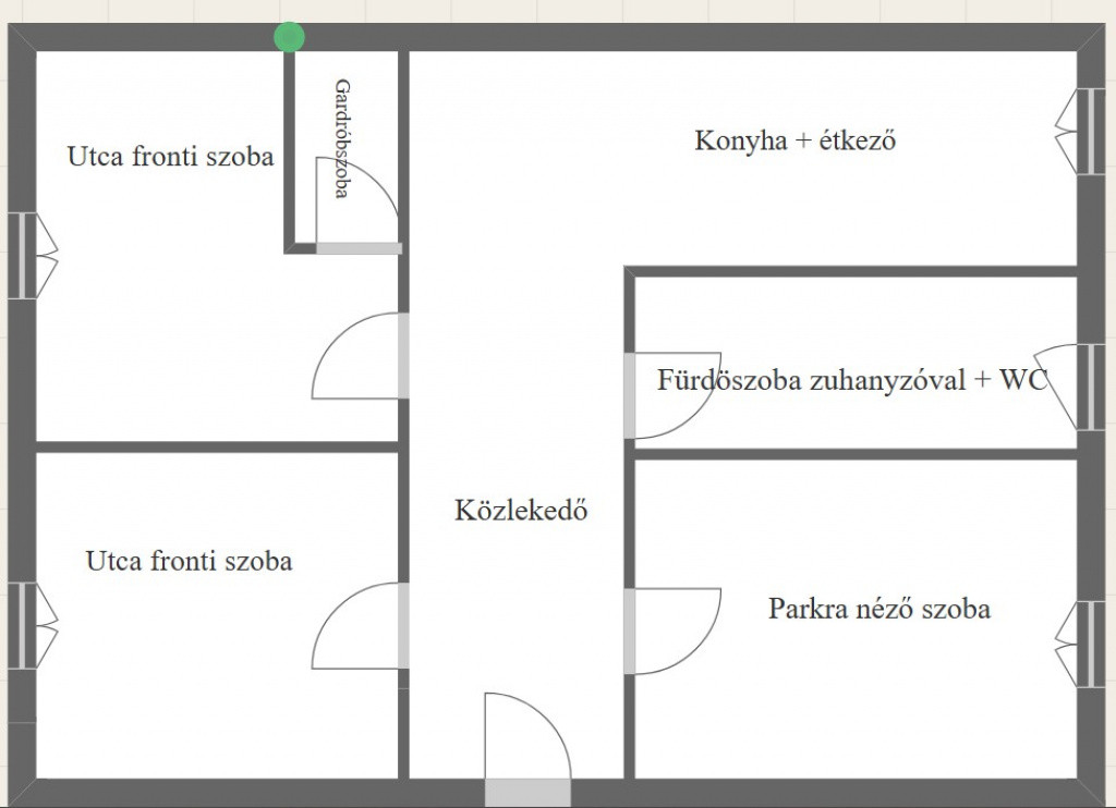 A három szoba közül kettő az utcafrontra néz, egy a parkra. Az egyikben szobában egy praktikus gardróbszoba is kialakításra került.