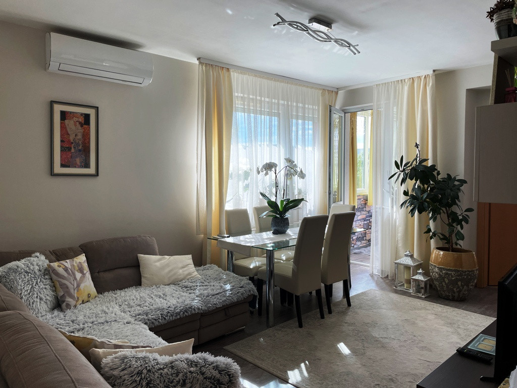 A lakás elrendezése: előtér, konyha, világos nappali+étkező, kijárat a beépített, alulról és felülről is szigetelt 6 m2-es erkélyre, kertre néző 2 szoba, gardrób, fürdőszoba+WC.