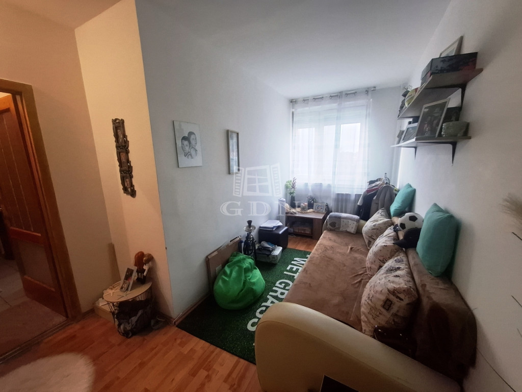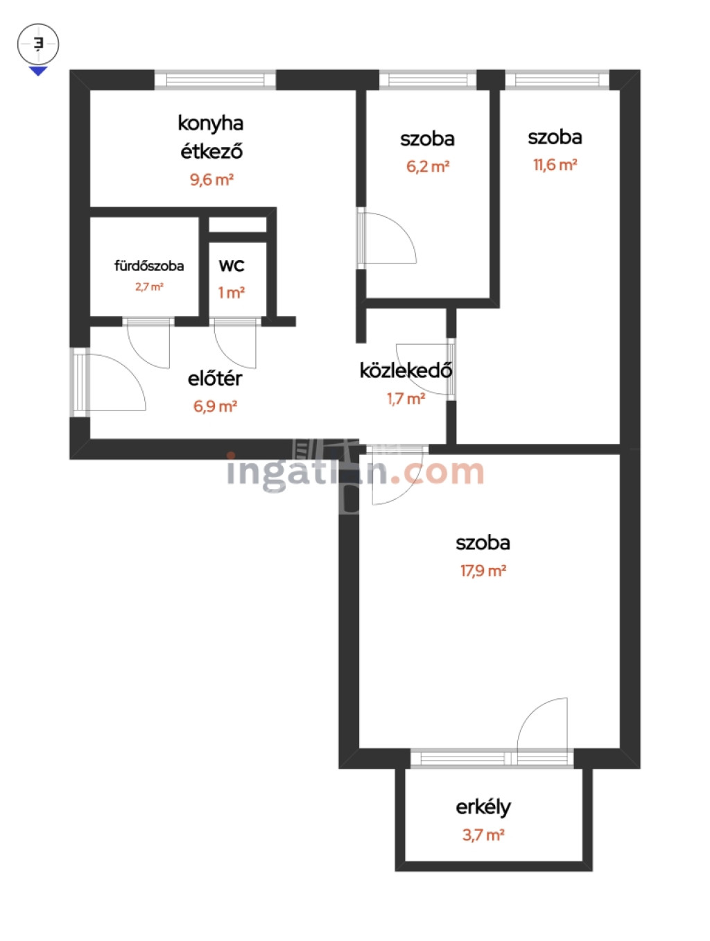 Elosztása: közlekedő/előtér 6,91 m2, szoba 17,91 m2, szoba 11,61 m2, félszoba 6,21 m2 konyha 9,65 m2, fürdőszoba 2,79 m2, toalett 1 m2, közlekedő .1,79 m2, erkély 4 m2