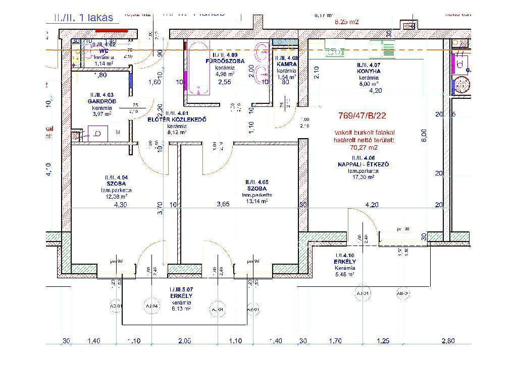 A lakás 70,27 m2, két, egyenként 6.13 illetve 5.45 nm-es erkéllyel rendelkezik, tartozik hozzá egy előtér, amerikai konyhás nappali és étkező, két szoba, gardrób, ízlésesen kialakított fürdőkádas fürdőszoba, önálló WC.