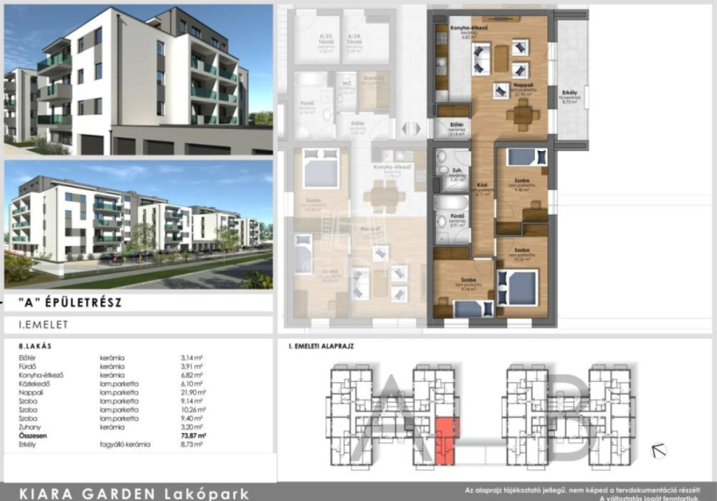 Szombathely zöldövezeti, dinamikusan fejlődő városrészén, energiahatékony, modern lakások várják új tulajdonosaikat. Kiara Garden lakóparkban kettő ütemben épülő , minden igényt kielégítő lakásai nappali+1 szobával, nappali+2 szobával, nappali+ 3 szobával fognak rendelkezni. Az ingatlanokhoz nagy erkélyek teraszok is tartoznak. A legnagyobb lakás dupla komfortos kialakítású lesz. Egyedülállóktól a nagy családosokig megfelelő otthona lehet bárkinek. A belváros közeli ingatlanok lehetőséget biztosítanak egyedi belső kialakításokra. A lakás gazdaságos fűtéséről és melegvíz ellátásáról távhő szolgáltató gondoskodik. A fűtésrendszer egyedileg szabályozható, saját hőmennyiség mérővel ellátott. A hőleadás padlófűtésen keresztül történik. Az ingatlanok ideális hőmérsékletét, a nappaliban elhelyezett split klíma biztosítja. Az épületben kellő számú zárható tároló kerül kialakításra, külön bejárattal. ( 2.96 m2-es tároló 1 790 000 Ft ) Természetesen vannak nagyobb tárolók is. A lakótömbök udvarán található felszíni parkolók ára 1 490 000 Ft. Bővebb tájékoztatásért kérem vegye fel velem a kapcsolatot. ...TOVÁBBI, TÖBBEZRES INGATLAN KÍNÁLAT: - GDN azonosító: 390662