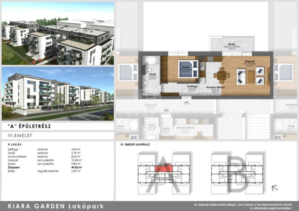 Szombathely zöldövezeti, dinamikusan fejlődő városrészén, energiahatékony, modern lakások várják új tulajdonosaikat. Kiara Garden lakóparkban kettő ütemben épülő , minden igényt kielégítő lakásai nappali+1 szobával, nappali+2 szobával, nappali+ 3 szobával fognak rendelkezni. Az ingatlanokhoz nagy erkélyek teraszok is tartoznak. A legnagyobb lakás dupla komfortos kialakítású lesz. Egyedülállóktól a nagy családosokig megfelelő otthona lehet bárkinek. A belváros közeli ingatlanok lehetőséget biztosítanak egyedi belső kialakításokra. A lakás gazdaságos fűtéséről és melegvíz ellátásáról távhő szolgáltató gondoskodik. A fűtésrendszer egyedileg szabályozható, saját hőmennyiség mérővel ellátott. A hőleadás padlófűtésen keresztül történik. Az ingatlanok ideális hőmérsékletét, a nappaliban elhelyezett split klíma biztosítja. Az épületben kellő számú zárható tároló kerül kialakításra, külön bejárattal. ( 2.96 m2-es tároló 1 790 000 Ft ) Természetesen vannak nagyobb tárolók is. A lakótömbök udvarán található felszíni parkolók ára 1 490 000 Ft. Bővebb tájékoztatásért kérem vegye fel velem a kapcsolatot. ...TOVÁBBI, TÖBBEZRES INGATLAN KÍNÁLAT: - GDN azonosító: 390672