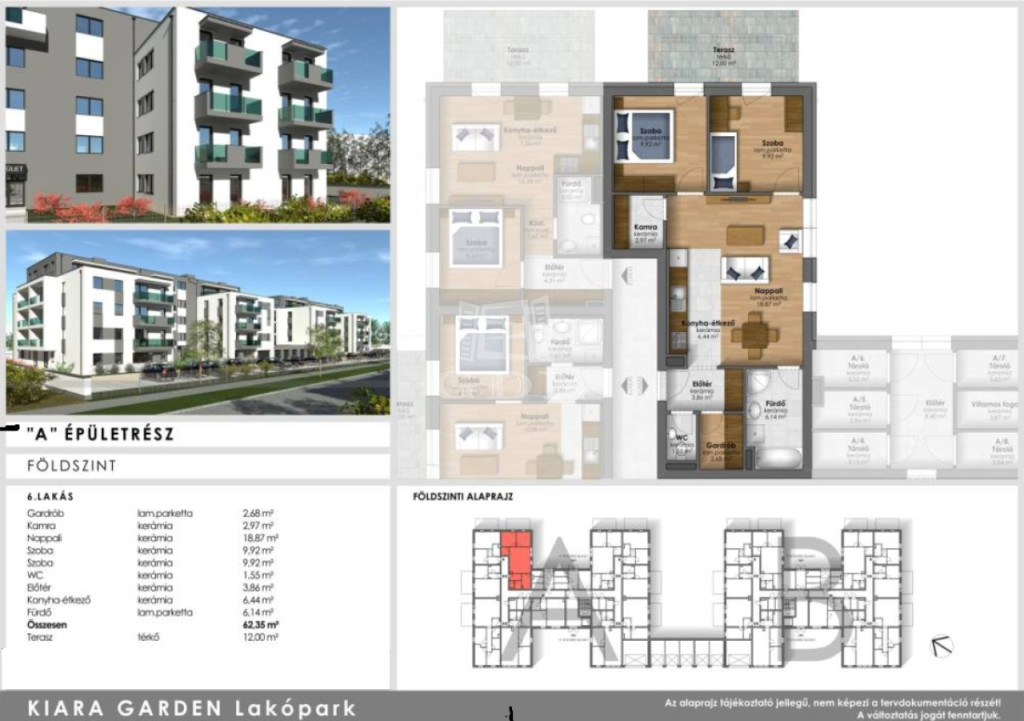 Szombathely zöldövezeti, dinamikusan fejlődő városrészén, energiahatékony, modern lakások várják új tulajdonosaikat. Kiara Garden lakóparkban kettő ütemben épülő , minden igényt kielégítő lakásai nappali+1 szobával, nappali+2 szobával, nappali+ 3 szobával fognak rendelkezni. Az ingatlanokhoz nagy erkélyek teraszok is tartoznak. A legnagyobb lakás dupla komfortos kialakítású lesz. Egyedülállóktól a nagy családosokig megfelelő otthona lehet bárkinek. A belváros közeli ingatlanok lehetőséget biztosítanak egyedi belső kialakításokra. A lakás gazdaságos fűtéséről és melegvíz ellátásáról távhő szolgáltató gondoskodik. A fűtésrendszer egyedileg szabályozható, saját hőmennyiség mérővel ellátott. A hőleadás padlófűtésen keresztül történik. Az ingatlanok ideális hőmérsékletét, a nappaliban elhelyezett split klíma biztosítja. Az épületben kellő számú zárható tároló kerül kialakításra, külön bejárattal. ( 2.96 m2-es tároló 1 790 000 Ft ) Természetesen vannak nagyobb tárolók is. A lakótömbök udvarán található felszíni parkolók ára 1 490 000 Ft. Bővebb tájékoztatásért kérem vegye fel velem a kapcsolatot. ...TOVÁBBI, TÖBBEZRES INGATLAN KÍNÁLAT: - GDN azonosító: 390654