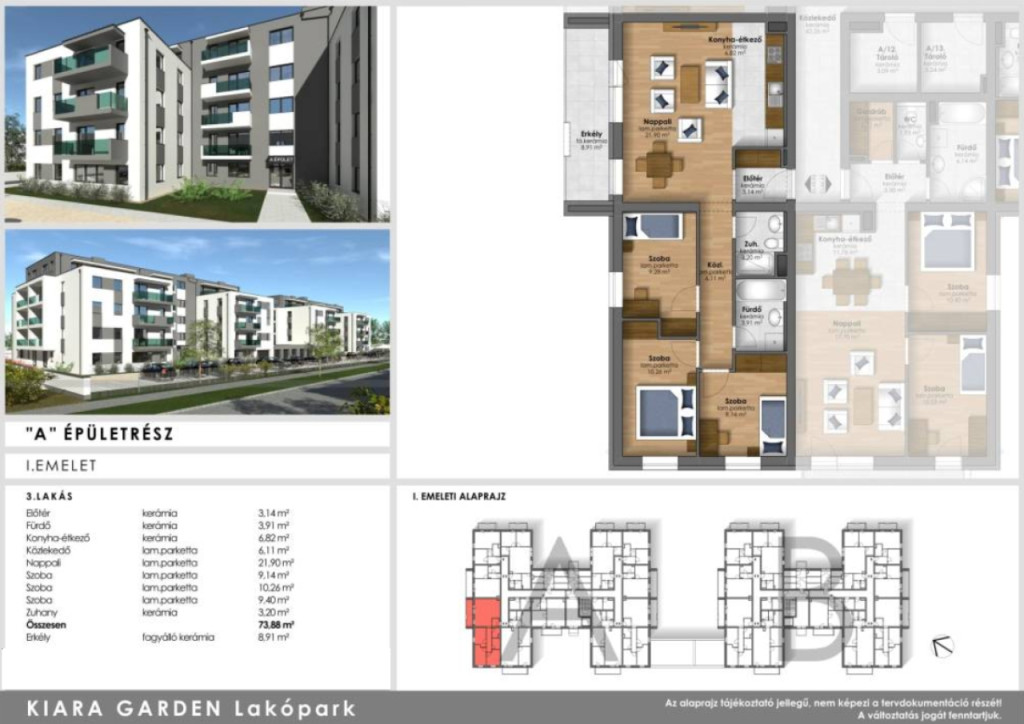 Szombathely zöldövezeti, dinamikusan fejlődő városrészén, energiahatékony, modern lakások várják új tulajdonosaikat. Kiara Garden lakóparkban kettő ütemben épülő , minden igényt kielégítő lakásai nappali+1 szobával, nappali+2 szobával, nappali+ 3 szobával fognak rendelkezni. Az ingatlanokhoz nagy erkélyek teraszok is tartoznak. A legnagyobb lakás dupla komfortos kialakítású lesz. Egyedülállóktól a nagy családosokig megfelelő otthona lehet bárkinek. A belváros közeli ingatlanok lehetőséget biztosítanak egyedi belső kialakításokra. A lakás gazdaságos fűtéséről és melegvíz ellátásáról távhő szolgáltató gondoskodik. A fűtésrendszer egyedileg szabályozható, saját hőmennyiség mérővel ellátott. A hőleadás padlófűtésen keresztül történik. Az ingatlanok ideális hőmérsékletét, a nappaliban elhelyezett split klíma biztosítja. Az épületben kellő számú zárható tároló kerül kialakításra, külön bejárattal. ( 2.96 m2-es tároló 1 790 000 Ft ) Természetesen vannak nagyobb tárolók is. A lakótömbök udvarán található felszíni parkolók ára 1 490 000 Ft. Bővebb tájékoztatásért kérem vegye fel velem a kapcsolatot. ...TOVÁBBI, TÖBBEZRES INGATLAN KÍNÁLAT: - GDN azonosító: 390658