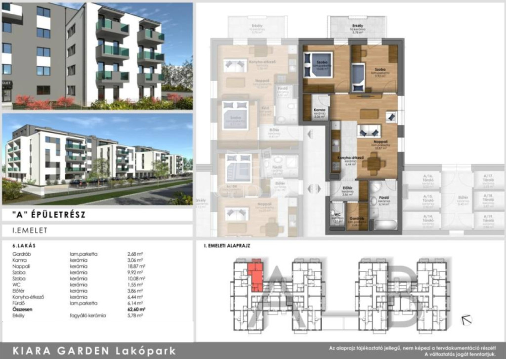 Szombathely zöldövezeti, dinamikusan fejlődő városrészén, energiahatékony, modern lakások várják új tulajdonosaikat. Kiara Garden lakóparkban kettő ütemben épülő , minden igényt kielégítő lakásai nappali+1 szobával, nappali+2 szobával, nappali+ 3 szobával fognak rendelkezni. Az ingatlanokhoz nagy erkélyek teraszok is tartoznak. A legnagyobb lakás dupla komfortos kialakítású lesz. Egyedülállóktól a nagy családosokig megfelelő otthona lehet bárkinek. A belváros közeli ingatlanok lehetőséget biztosítanak egyedi belső kialakításokra. A lakás gazdaságos fűtéséről és melegvíz ellátásáról távhő szolgáltató gondoskodik. A fűtésrendszer egyedileg szabályozható, saját hőmennyiség mérővel ellátott. A hőleadás padlófűtésen keresztül történik. Az ingatlanok ideális hőmérsékletét, a nappaliban elhelyezett split klíma biztosítja. Az épületben kellő számú zárható tároló kerül kialakításra, külön bejárattal. ( 2.96 m2-es tároló 1 790 000 Ft ) Természetesen vannak nagyobb tárolók is. A lakótömbök udvarán található felszíni parkolók ára 1 490 000 Ft. Bővebb tájékoztatásért kérem vegye fel velem a kapcsolatot. ...TOVÁBBI, TÖBBEZRES INGATLAN KÍNÁLAT: - GDN azonosító: 390661