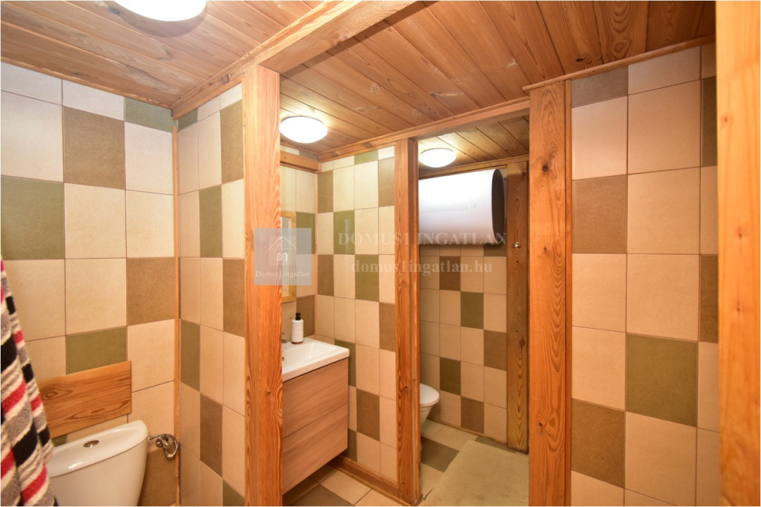 Alsó szinten egy nappali galériás pihenővel-hálóval, egy közlekedő, fürdőszoba zuhanyzóval, dupla wc-vel, egy igényes, minőségi anyagok felhasználásával készült konyhával, kamrával és egy étkezővel várja új tulajdonosát.