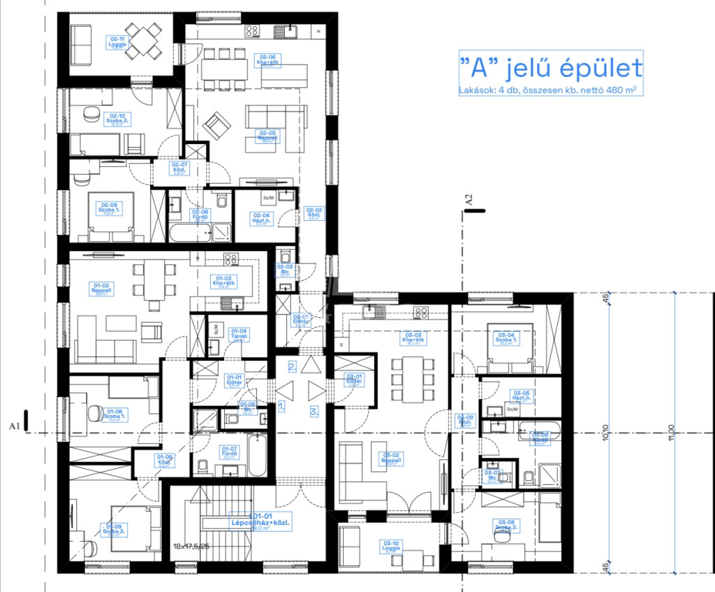 Az " A " épület bal oldalán 3 db emeleti lakás loggiával.