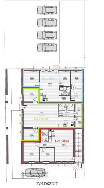 Földszint 3-as lakás / nappali + 3 szoba (59.37m2), Ára: 76.7mFt: konyha (3.60m2) – étkező – nappali (19.33m2), közlekedő (2.76m2), fürdőszoba (3.75m2), gardrób (5.50m2), 3 szoba (7.71m2, 6.64m2, 9.93m2). /Kód: 5198/
