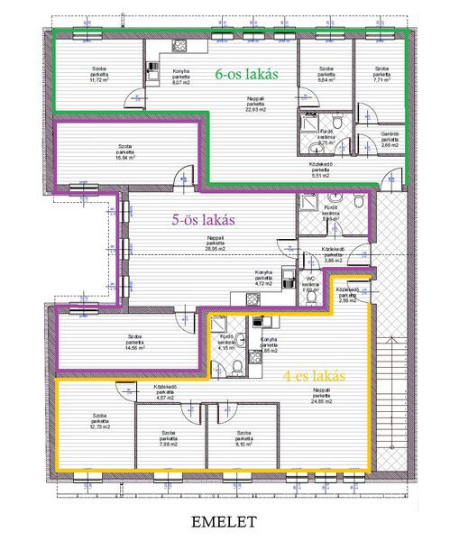 6-os lakás / nappali + 3 szoba (68.98m2), Ára: 89.7mFt: közlekedő (5.51m2), gardrób (2.65m2), fürdőszoba (3.75m2), 3 szoba (6.64m2, 7.71m2, 11.72m2), konyha (8.07m2) – étkező – nappali (22.93m2). /Kód: 5201/
