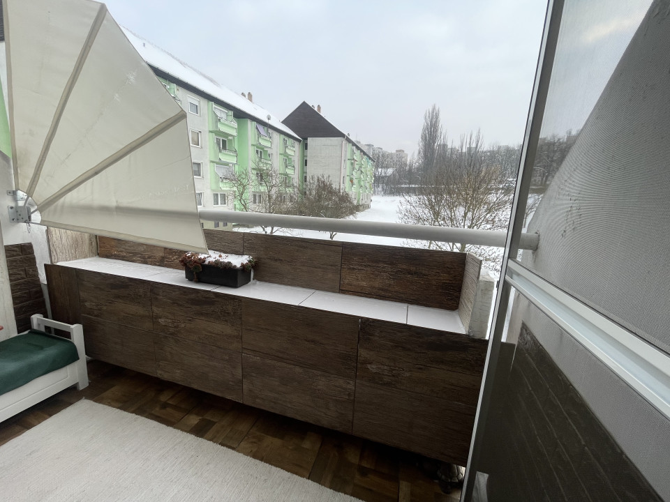 A zöldövezetre néző erkély kiváló helyszíne a pihenésnek, reggeli kávézásnak vagy esti kikapcsolódásnak.