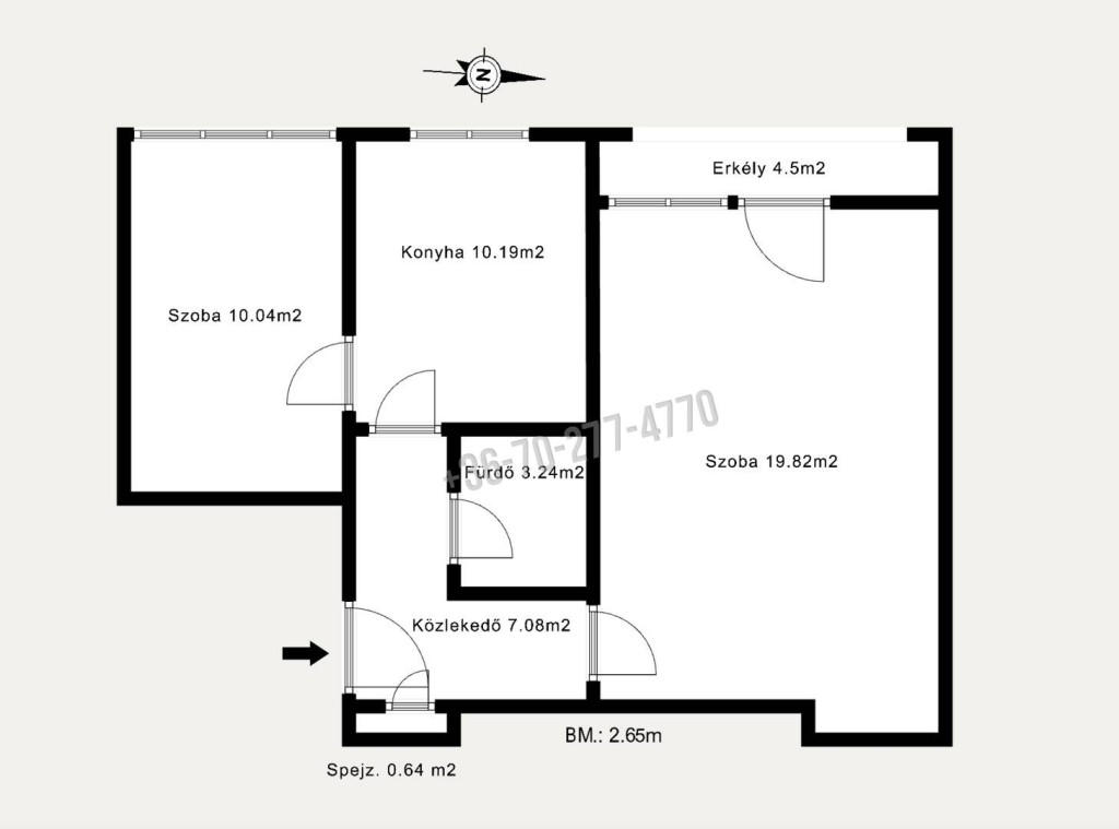 A lakás világos, délnyugati fekvésű és remek elrendezésű: szobái külön nyílnak, tágas nagy konyhával, nagy erkéllyel rendelkezik. Nappali, hálószoba, előszoba, praktikus konyha, kamra, valamint fürdőszoba (káddal és egy helyiségben a WC-vel) biztosítja a mindennapi kényelmet.