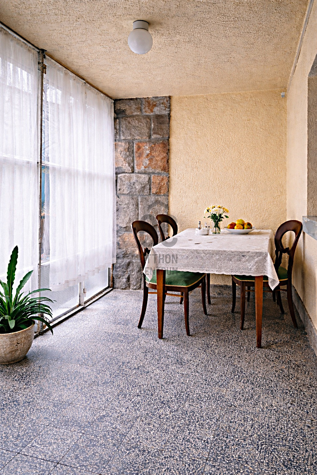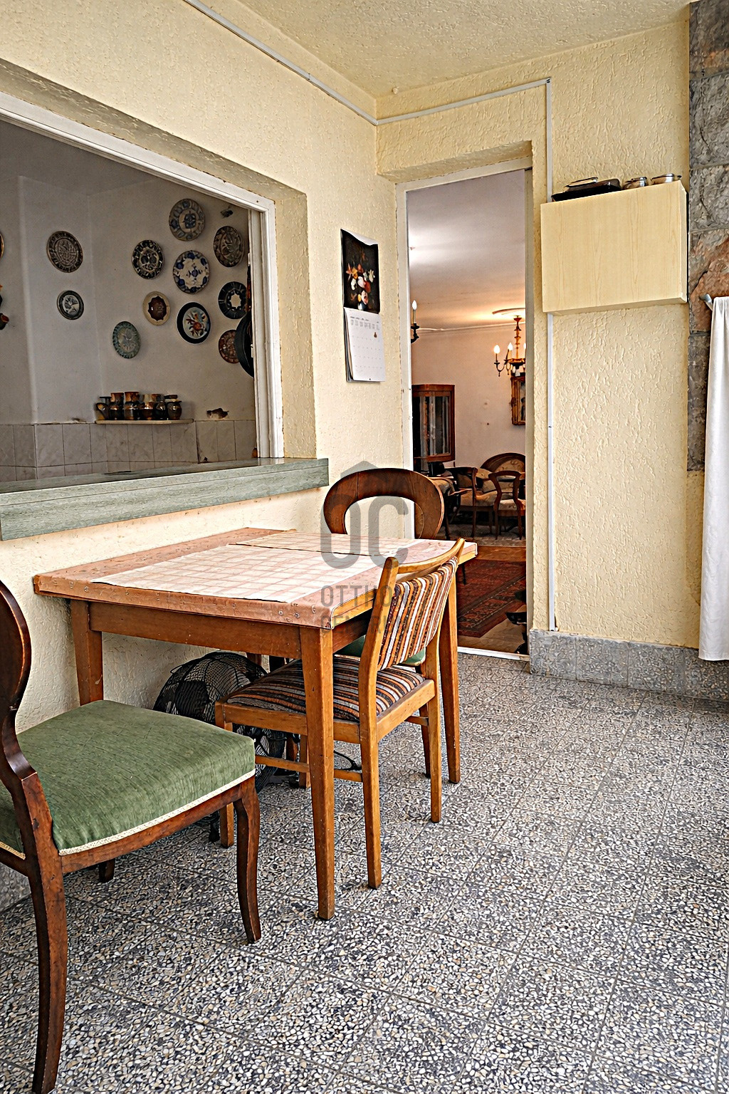 A terek arányosak, átgondoltak, finoman őrzik egy igényes, kulturált múlt lenyomatát. A konyha és az üvegezett veranda közötti nagy tálalóablak különleges kapcsolatot teremt: a veranda egész évben használható, természetközeli étkezőként működik, közvetlen kertkapcsolattal.