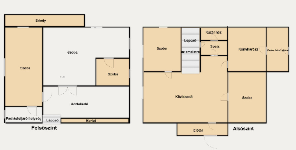 Az ingatlan helységei: alsószint: előtér, közlekedő, két hálószoba, fürdő külön wc, spájz, kazánház