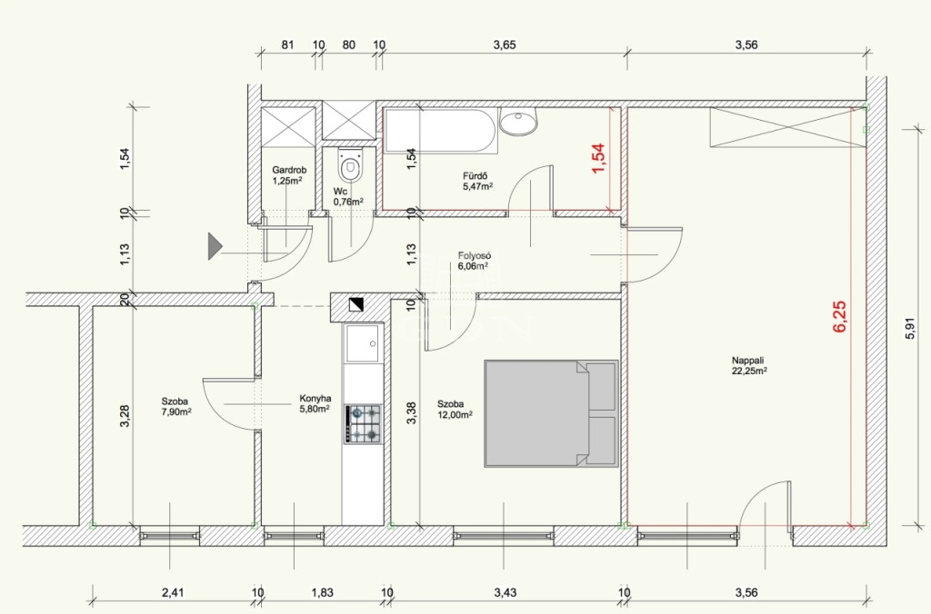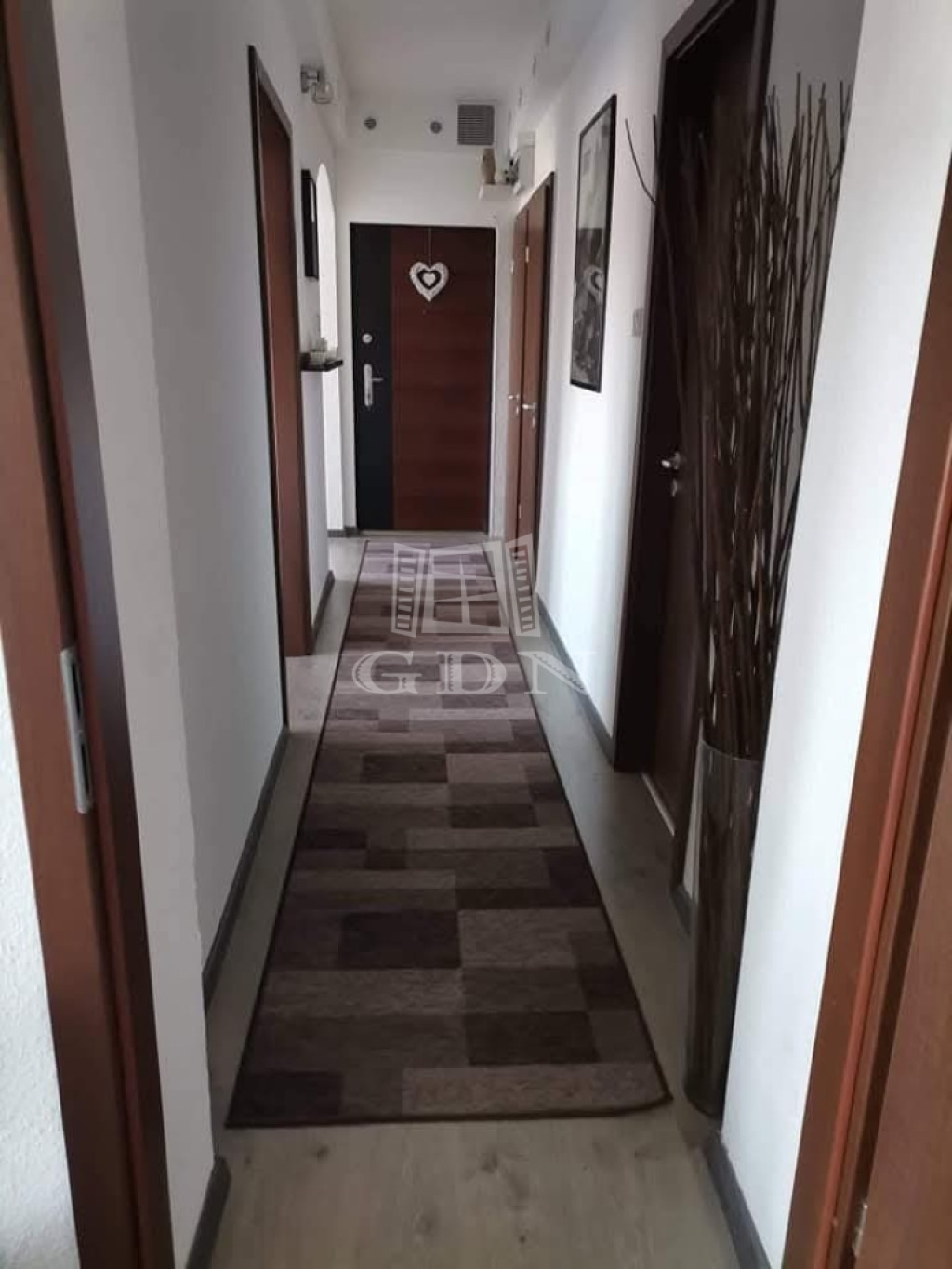 A lakás 4 szintes társas-ház negyedik emeletén helyezkedik el. Elosztása: előtér 6,06 m2, nappali 22,25 m2, szoba 12,00 m2, szoba 7,90 m2, konyha 5,80 m2, fürdőszoba 5,47 m2, külön toalett 0,76 m2, gardrób 1,25 m2, az ingatlanhoz a földszinten 4 nm zárható tároló is tartozik