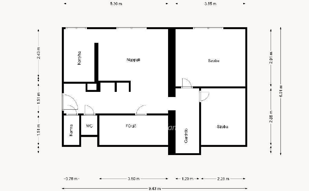 A lakás elrendezése rendkívül praktikus: amerikai konyhás nappali, hálószoba, félszoba (dolgozó vagy gyerekszoba, külön gardrób, kamra, külön WC, fürdőszoba épített mosdóval és sarokkáddal.