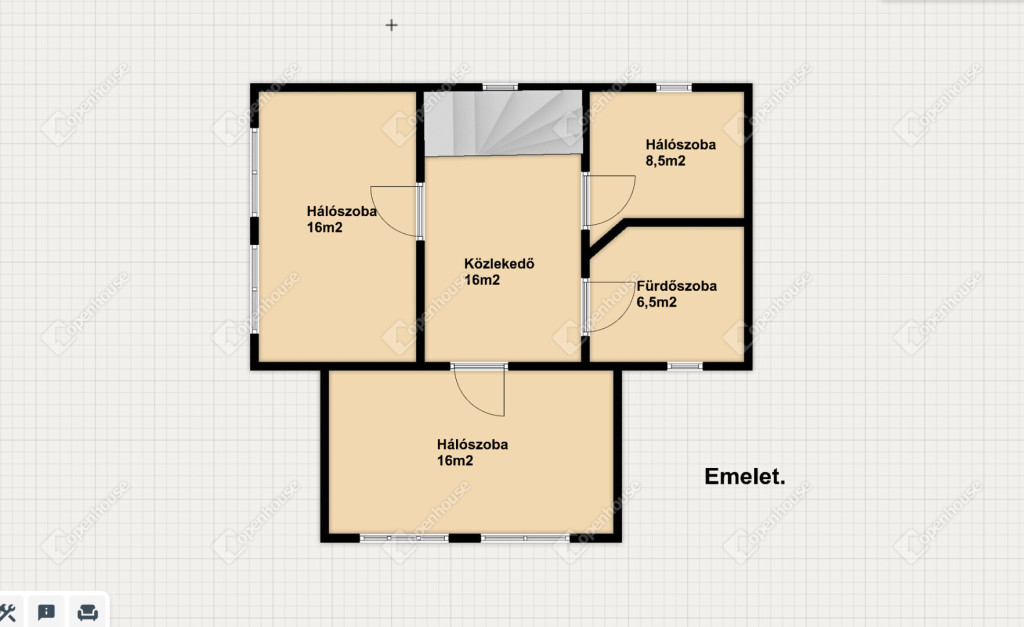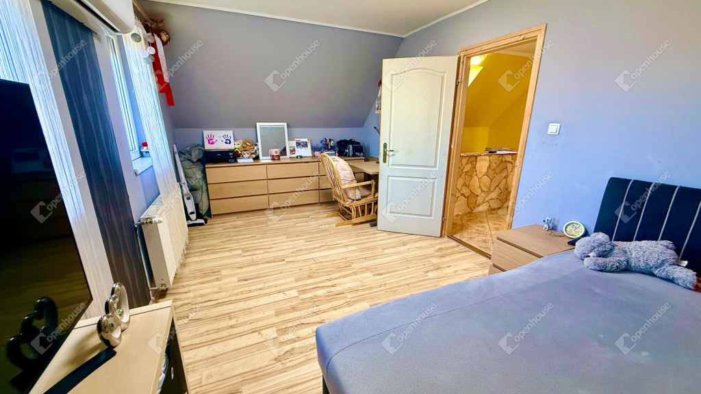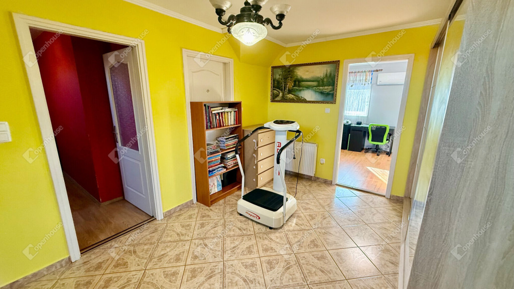 Emelet: társalgó, közlekedő, 3 hálószoba, és egy újabb fürdőszoba.