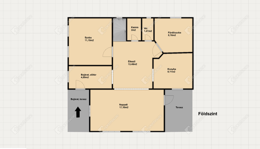 Földszint: előtér, étkező, konyha, tágas nappali, fürdő, külön WC, és egy szoba.