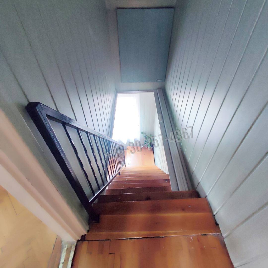 Elosztása alsó szinten: előszoba, konyha, fürdő+wc, nappali. A felső szinten előtér és két hálószoba.