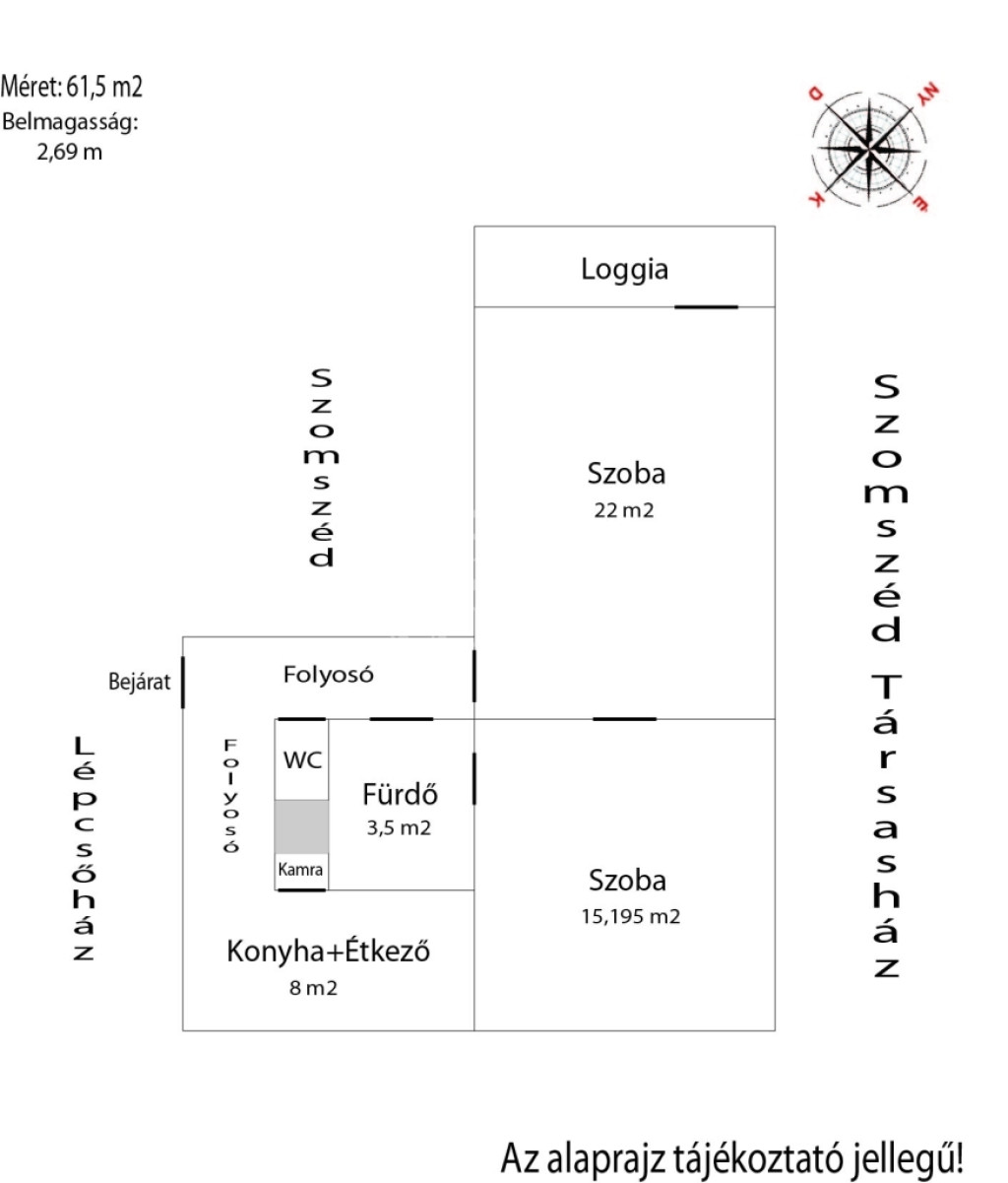 A 61,5 m2-es lakás a magasföldszinten helyezkedik el, délnyugati fekvéssel.