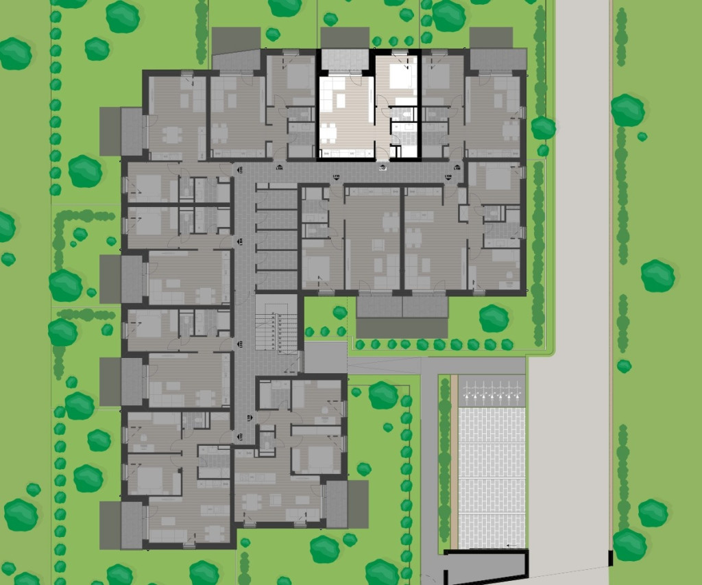 A társasház földszintjén található L13 lakás 43,55 m2 nettó alapterületű, melyhez 5,58 m2 erkély tartozik. Ennek a bruttó 46.798.028,- Ft-os ára fűtéskész állapotra vonatkozik. A lakáshoz egy udvari gépkocsi beálló is tartozik bruttó 1,5 M Ft összegben, amelyet az előbb említett vételár nem tartalmaz. Igény esetén még egy beálló megvásárlására is van lehetőség és egy tároló megvétele is lehetséges.
