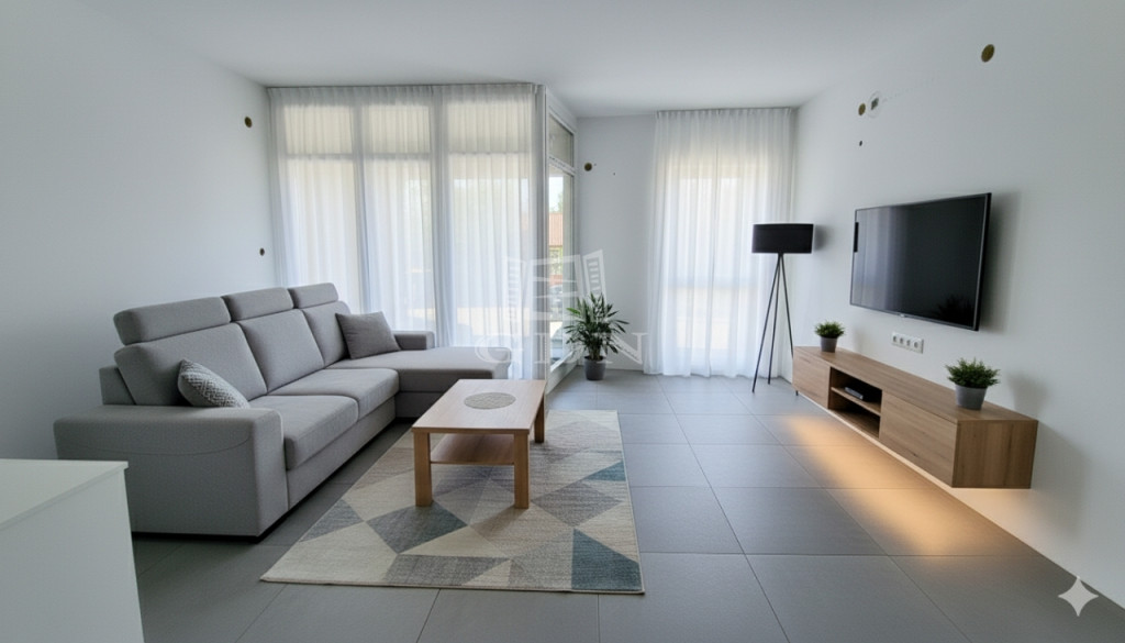 A fent meghirdetett lakás 58 m²-es, a 2. emeleten helyezkedik el, amerikai konyhás nappali + 1 háló. Tartozik hozzá egy 20.5 m²-es terasz,( a panoráma képek a teraszon állva készültek) valamint a közös kert és egy gépkocsi beálló, közös tároló.