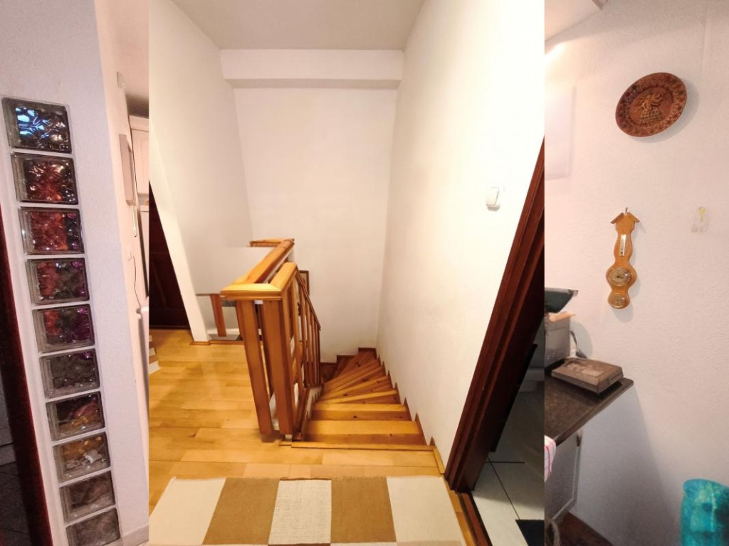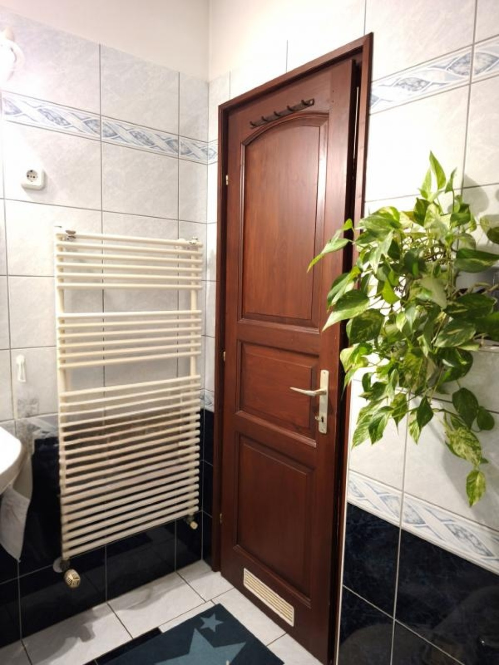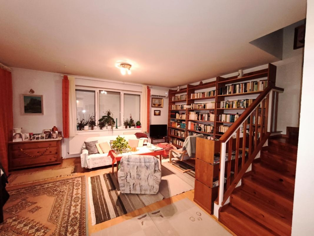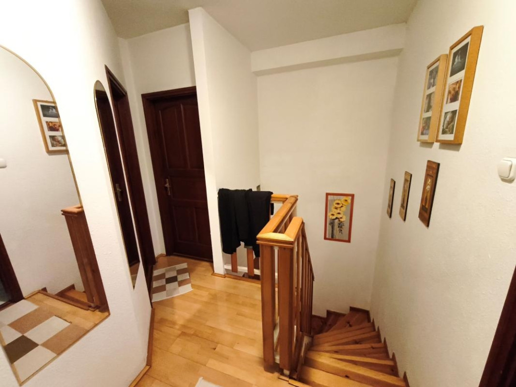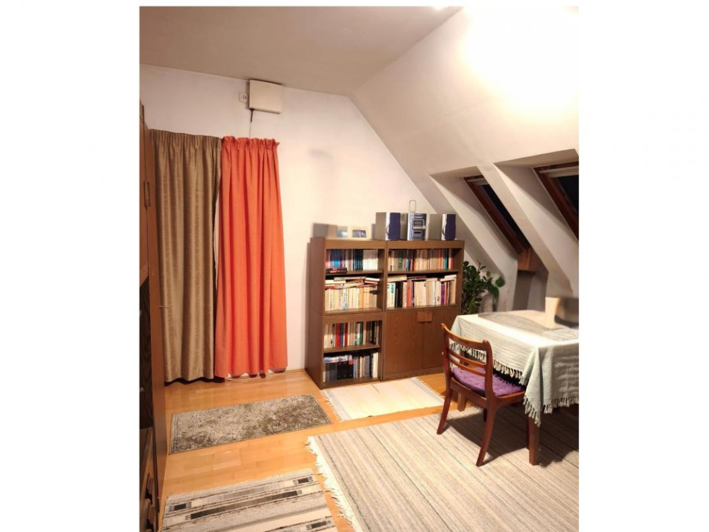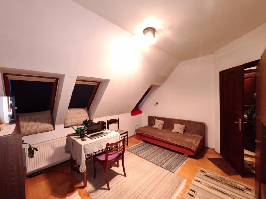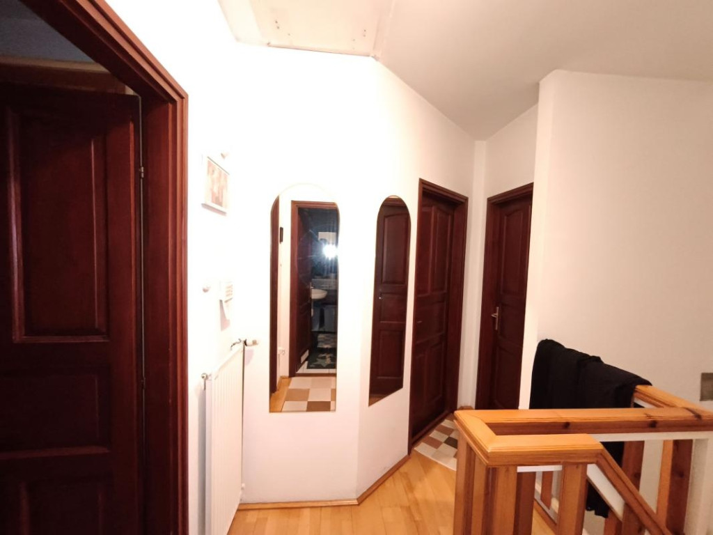 TETŐTÉR: igényes fa lépcső vezet a felső szintre, ahol a közlekedőből 1 hálószoba nyílik, továbbá a nagy méretű fürdőszoba nagy sarokkáddal, toalettel és bidével, kézmosóval, külön bejárattal a gardrob helyiséggel, ill. a közlekedőből nyílik a harmadik, jelenleg dolgozónak használt szoba is.