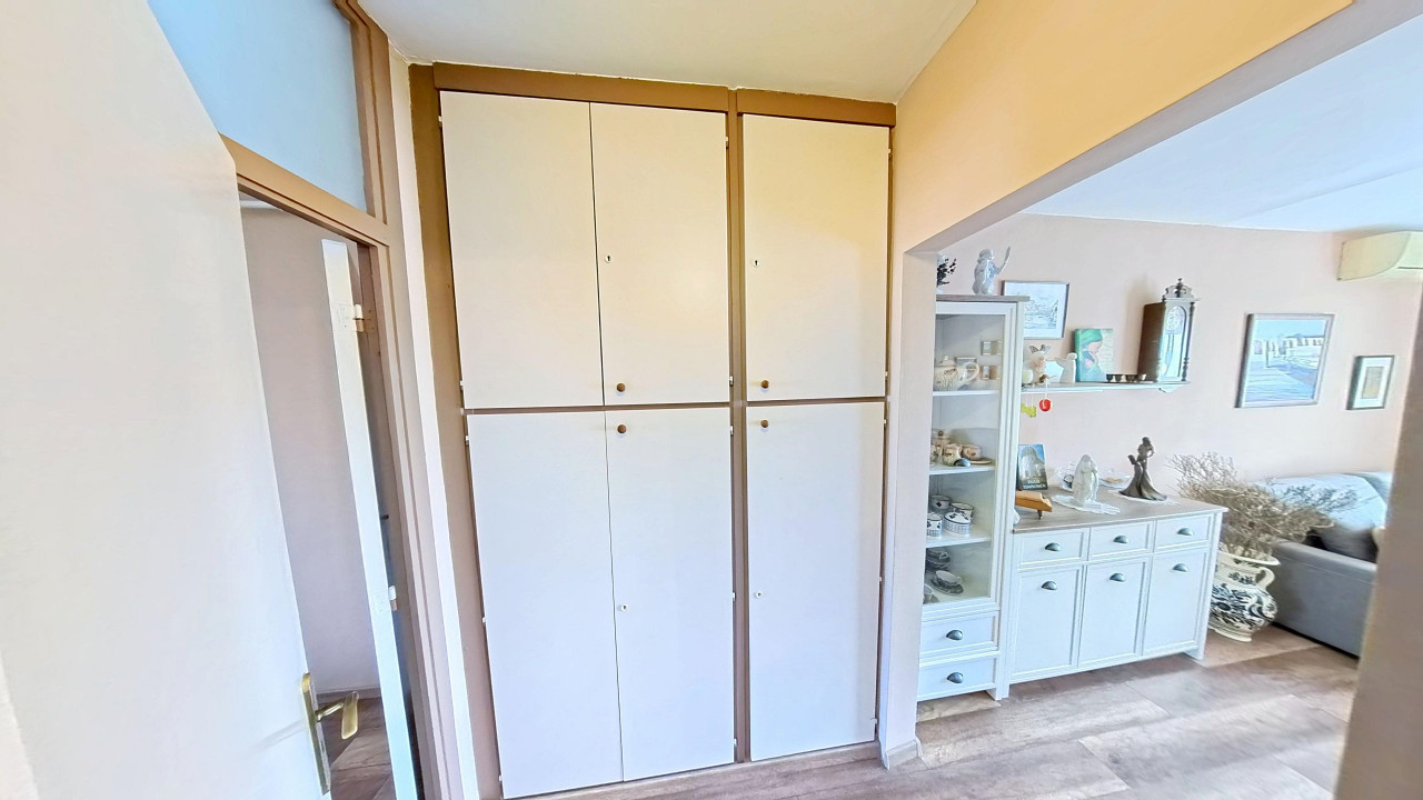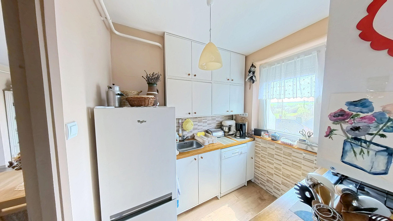 Tovább haladva a konyha-étkező-nappali térbe érkezünk. A konyha külön helyiségként jobbra van. Az étkezőből balra egy kis közlekedőn keresztül juthatunk el a másik hálószobába. A közlekedőben szintén mennyezetig érő, a már megszokott színvonalon kivitelezett beépített szekrény van, valamint innen nyílik a SZÉPEN FELÚJÍTOTT WC-KÉZMOSÓ is.