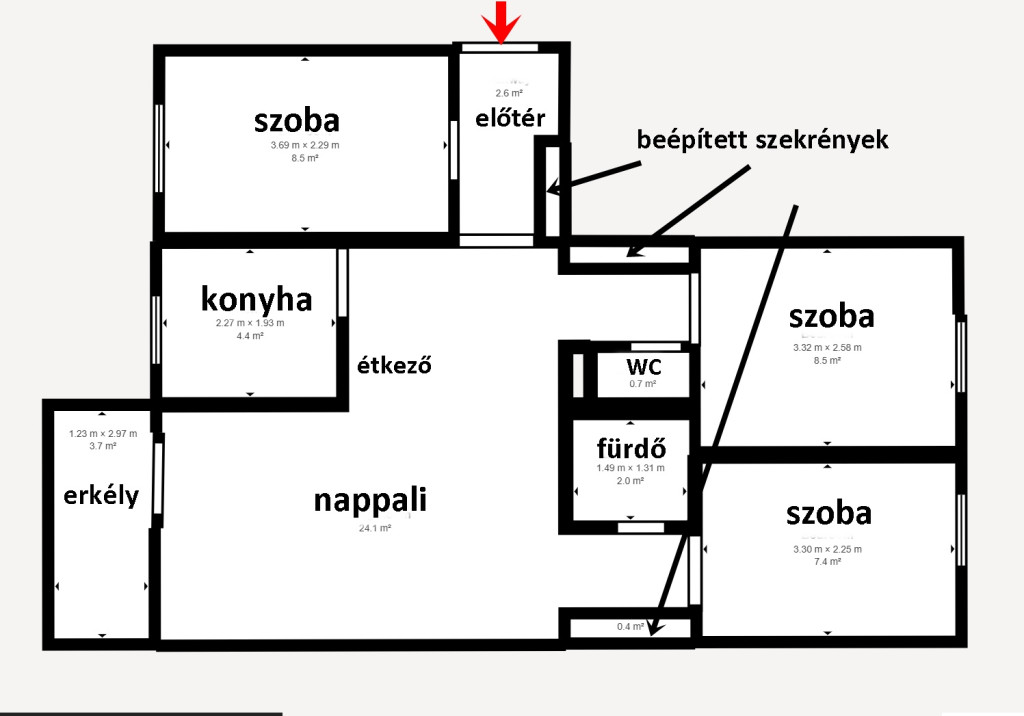 A HŐSZIGETELT épületben található, REMEK ELRENDEZÉSŰ lakás a 3. emeleten van. A nyílászárók hőszigetelt műanyagok, melyeken REDŐNY is van. A lakásban 3 JÓL BÚTOROZHATÓ, EGYMÁSTÓL JÓL ELKÜLÖNÜLŐ HÁLÓSZOBÁT találunk, ezáltal mind a nappali életterek, mind a pihenést szolgáló helyiségek kiválóan elválasztódnak egymástól. A lakásba belépve egy kényelmesen tágas előtérbe érkezünk, ahol MENNYEZETIG ÉRŐ, BEÉPÍTETT SZEKRÉNY segít a tárolásban. Az előtérből jobbra nyílik az egyik hálószoba.