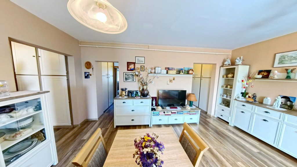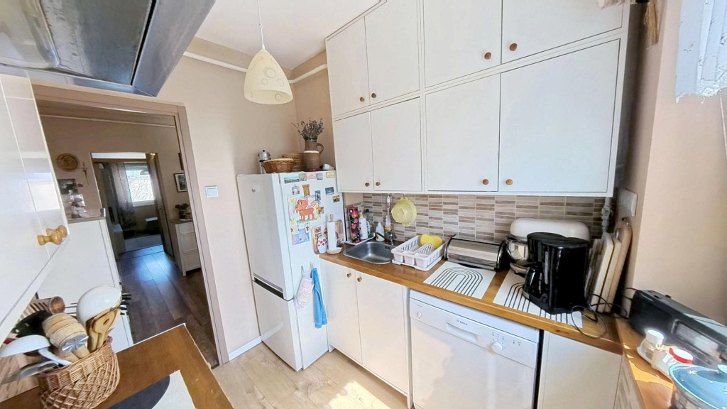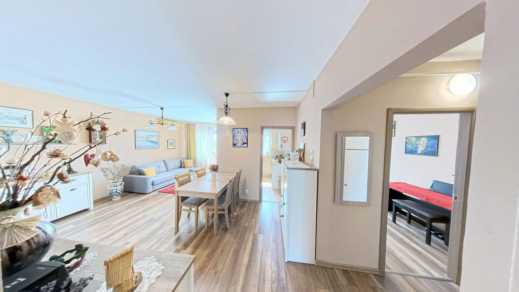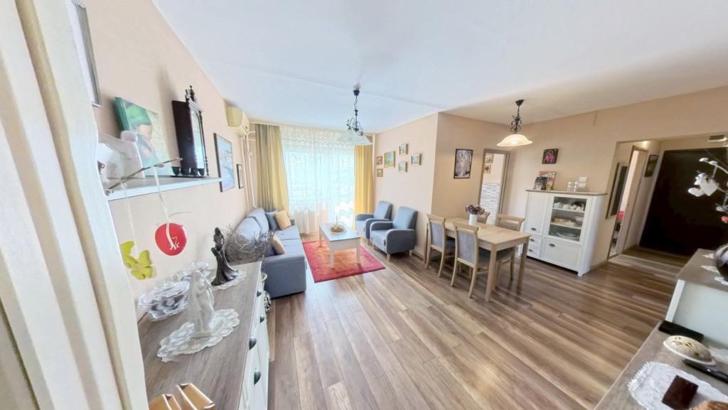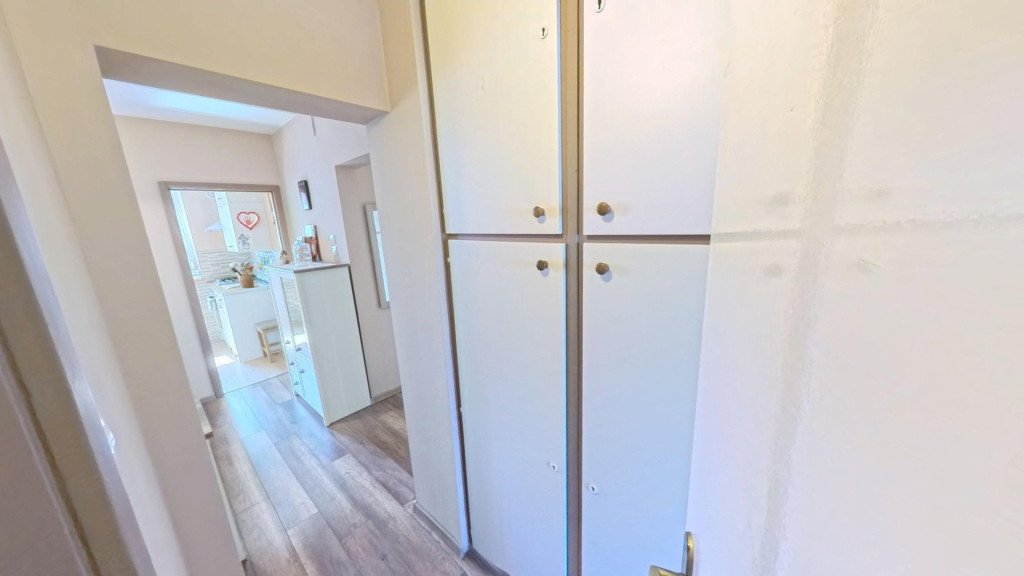 Tovább haladva a konyha-étkező-nappali térbe érkezünk. A konyha külön helyiségként jobbra van. Az étkezőből balra egy kis közlekedőn keresztül juthatunk el a másik hálószobába. A közlekedőben szintén mennyezetig érő, a már megszokott színvonalon kivitelezett beépített szekrény van, valamint innen nyílik a SZÉPEN FELÚJÍTOTT WC-KÉZMOSÓ is.