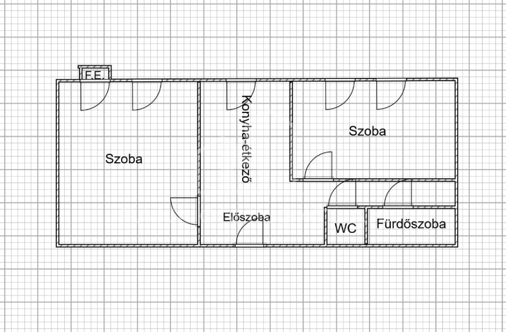 A két szoba a lakás két oldalán helyezkedik el, közöttük található a konyha-étkező és a fürdőszoba, valamint egy közlekedő, beépített gardróbbal.