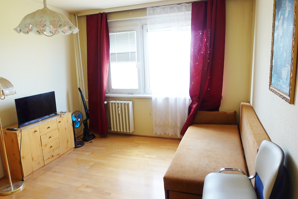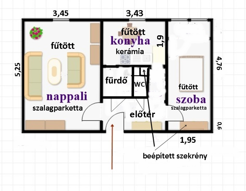 A lakásba belépve egy előtérbe érkezünk. Innen nyílik balra a TÁGAS, VILÁGOS NAPPALI. A bejárattal szemben a FÜRDŐSZOBA és a külön WC található. A bejárattól jobbra egy kis közlekedőről nyílik a konyha. A közlekedőben bal oldalt a konyha előtt BEÉPÍTETT SZEKRÉNYT találunk.