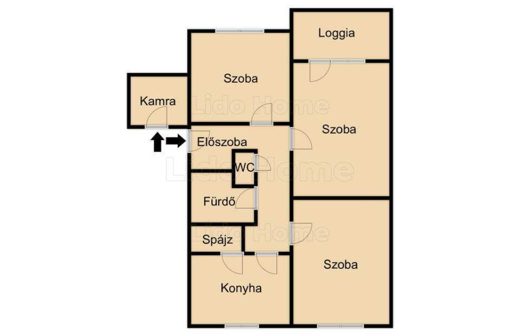 -A lakótérben három szoba, egy konyha, egy spájz, egy fürdőszoba, külön helyiségben toalett található, valamint egy loggia